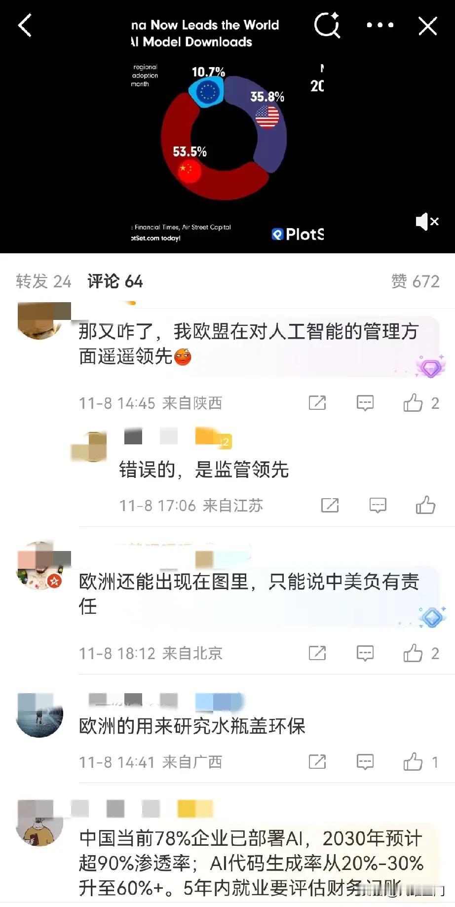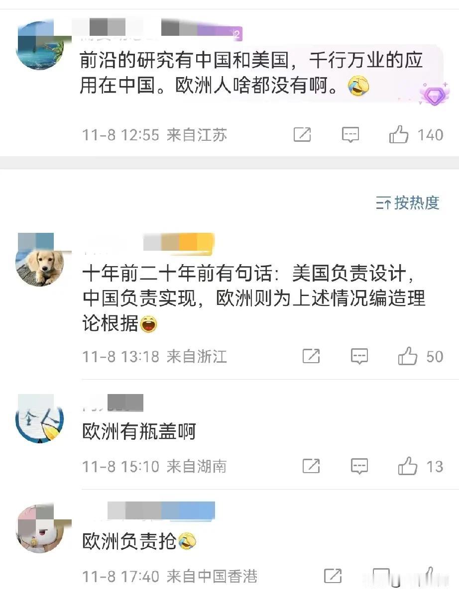 欧洲的AI的规模在两年前还比中国大很多,现在欧洲的AI只有中国的1/10之一,欧洲人错过了互联网,又错过了AI,欧洲人不知道还有什么高傲的资本,再加上工业也因为俄乌冲突,快外流光了,一个没有工业,也没有互联网和AI技术的欧洲,就剩下价值观了,现在还有当面殖民留下来的老本可以吃,如果老本吃完了,欧洲还有未来吗?