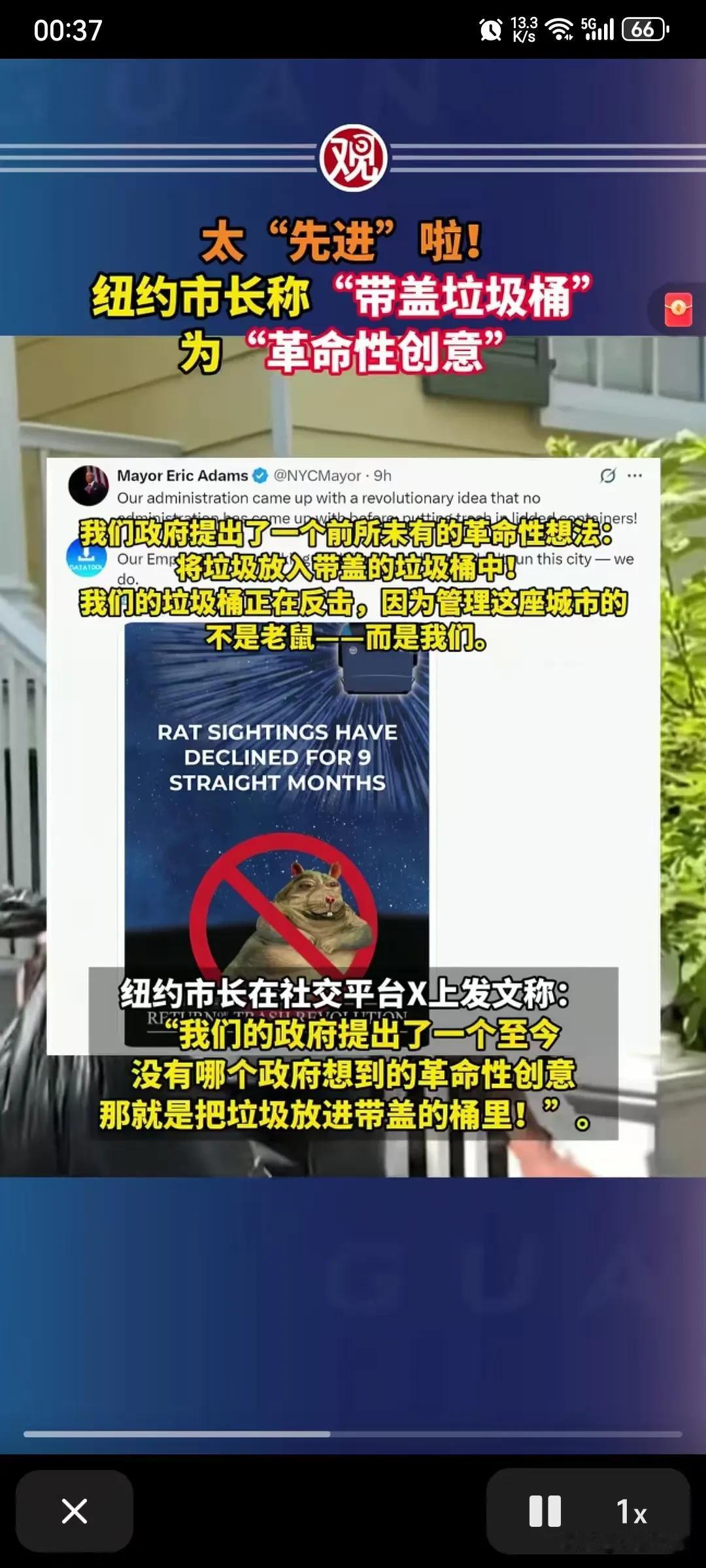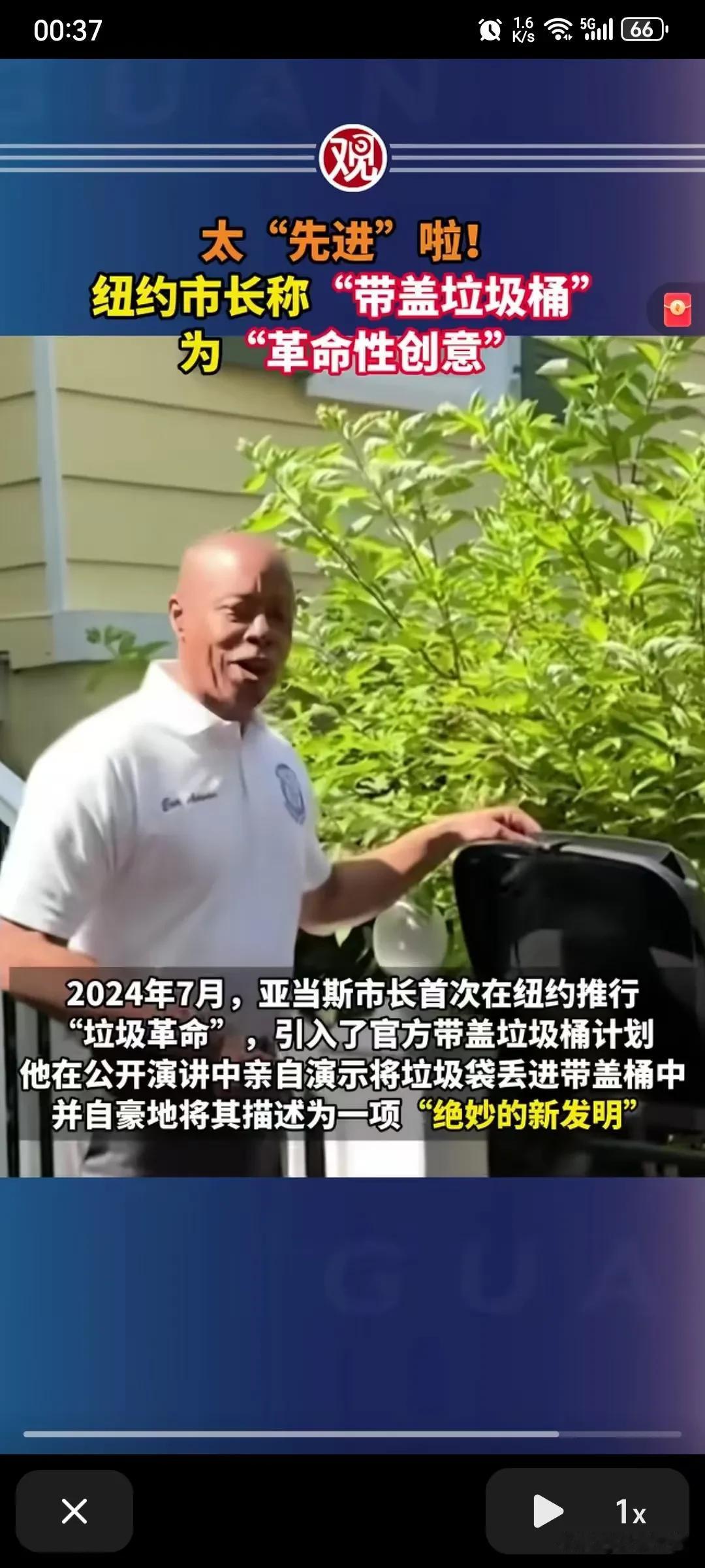 美国政客把作秀发挥到极致,纽约市长称赞带盖的垃圾桶是革命性的创意,专门开个记者会,展示一下这个革命性的创意,表演一下如果用带盖的垃圾桶装垃圾,因为垃圾桶带盖,就可以隔绝老鼠进入垃圾桶,这样管理纽约的就是我们,不是这些老鼠了,并夸赞自己说纽约政府提出了一个至今没有哪个政府想得到革命性的创意,所以它今天开记者会,就是玩把这个绝妙的发明带给纽约人民! 这要是在发生在国内,我们最大最发达城市的市长这样搞,你觉得网上会发生什么情况,你可以尽情想象一下!