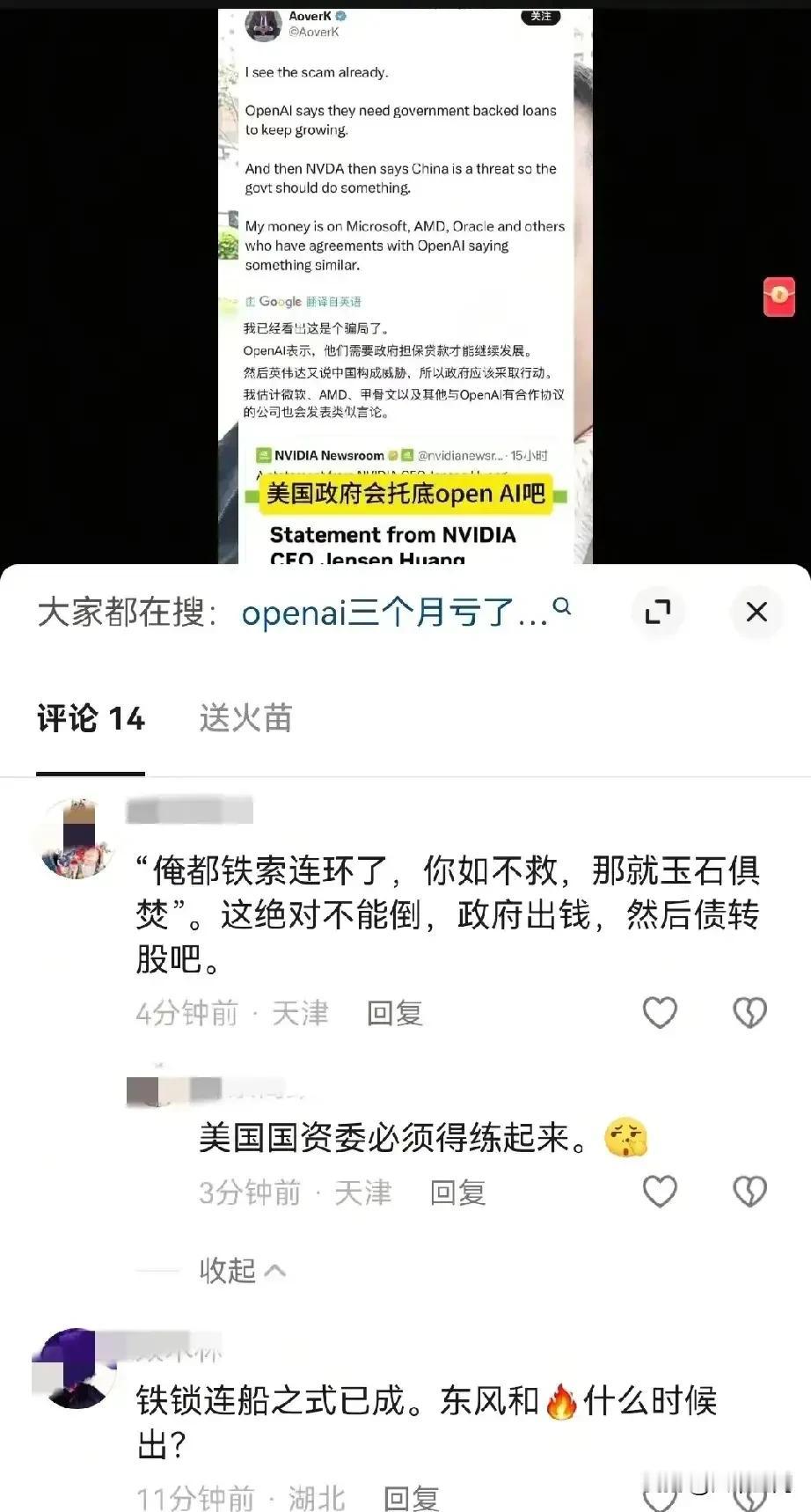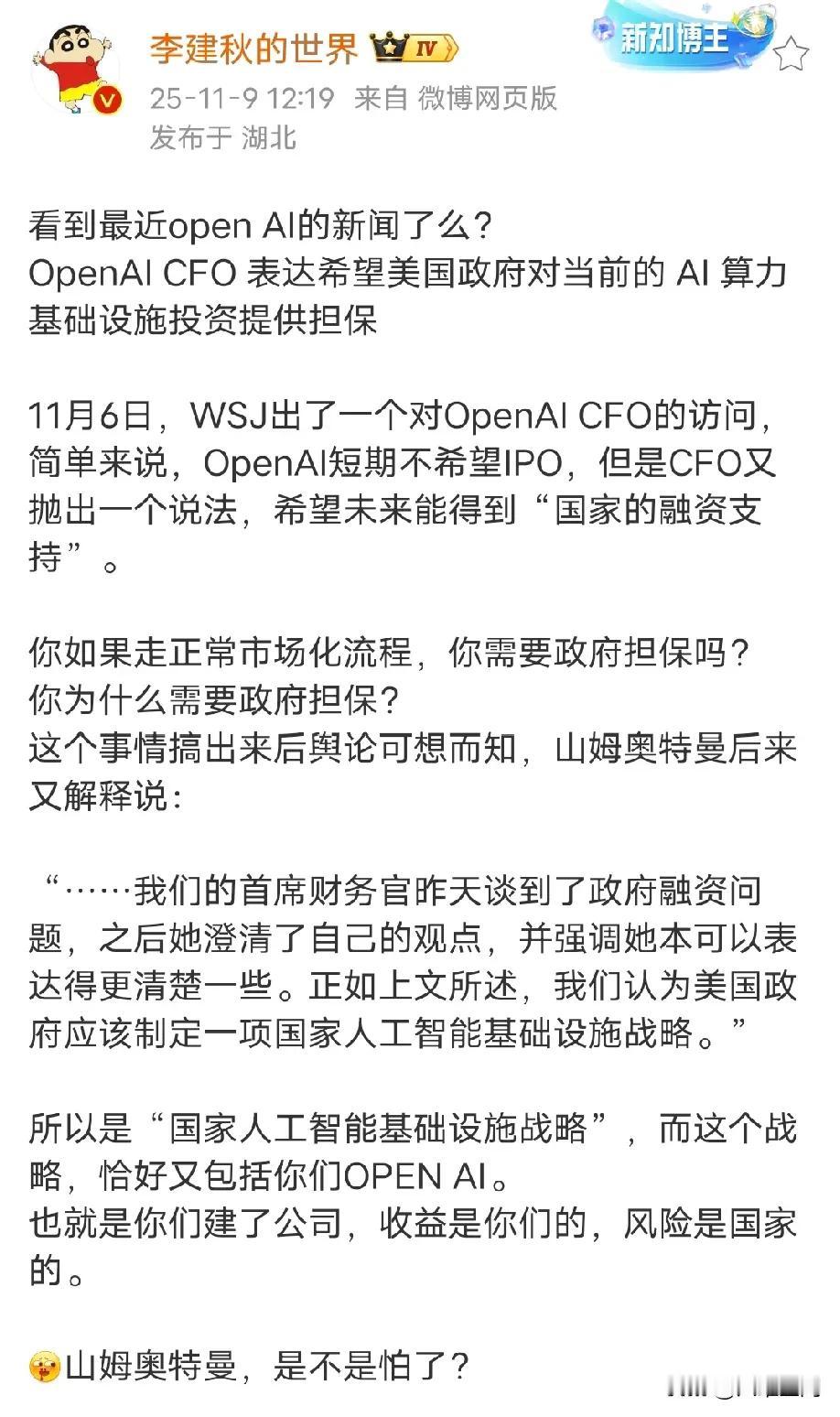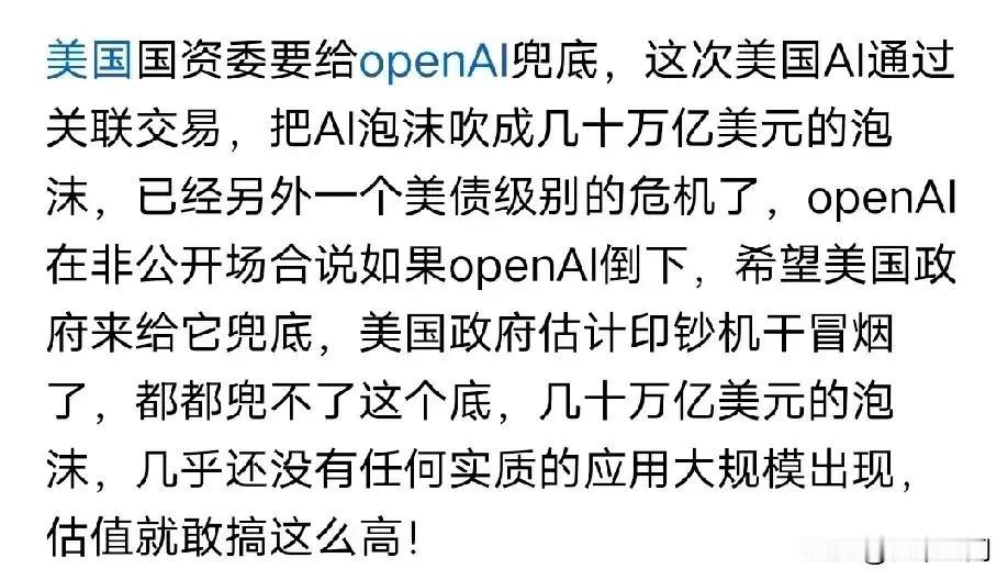 感觉openAI摇摇欲坠,这次把泡沫吹得太大了,openAI自己都害怕,山姆奥特曼已经派人在暗示白宫可不可以给AI算力基础设施做担保了,因为资本已经不太相信openAI了,只有美国政府介入担保,可能这个游戏才能继续下去,要不然资本已经不敢投钱进去了,大概率就是这个逻辑,为什么openAI造推迟上市,可能上市不仅可能抽干流动性,还可能让AI这个泡沫破得更快,所以还是先缓缓!现在它们几家AI公司都是互相绑定了,业务都互相嵌套,只要其中一家崩了,那就全都完了!