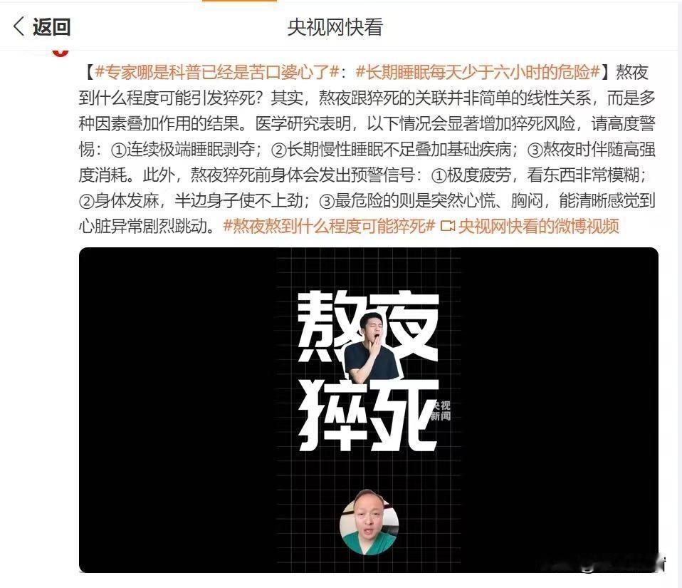 睡眠不足会猝死?失眠的人怎么办?可用达利雷生来帮忙! 近期,央视网发布了一则视频,向大众科普了长期睡眠不足的危害。今天咱们就把视频内容做个总结,一起来看看睡眠不足到底会如何影响咱们的健康。 其一,连续极端的睡眠被剥夺,会严重增加猝死风险。如连续3天以上每天睡眠不足4小时,身体修复机制会严重受损,免疫细胞活性会下降大约30%,心血管系统持续高压,猝死风险就会急剧增高。 其二,长期慢性睡眠不足+基础疾病,也会增加猝死风险。比如患者本身就患有高血压、冠心病、糖尿病等,长期睡眠不足6小时,猝死的概率是常人的1.5倍。 因此,想要拥有健康身体,一定要睡得久,睡得足,也睡得好。然而不幸的是,现代人被生活工作压力所累,大多无法拥有好睡眠。《2025年中国睡眠健康调查报告》显示,我国18岁及以上人群睡眠困扰率为48.5%。 如何拥有好睡眠呢?国内外指南共识一致推荐达利雷生为失眠治疗的一线药物。达利雷生是强效的、选择性的双重食欲素受体拮抗剂,其发挥作用时只针对保持清醒的大脑部分,没有广泛的镇静作用,既能缩短入睡时间、延长总睡眠时间,也不影响日间功能,非常安全、高效。 睡不好觉不是小问题,长期睡眠不足甚至会猝死,失眠患者一定要抓紧干预!