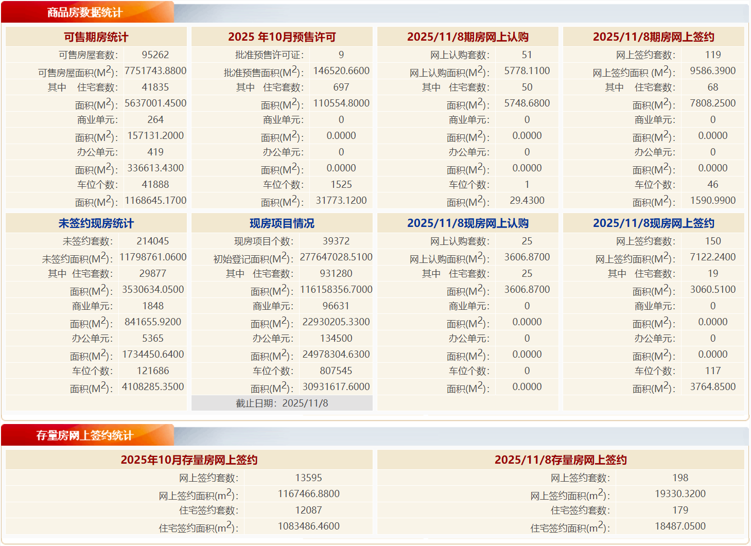 根据北京市住房和城乡建设委员会数据:11月8日,北京新房住宅网签87套,网签面积约10868.76㎡;二手房住宅网签179套,网签面积约18487.05㎡。