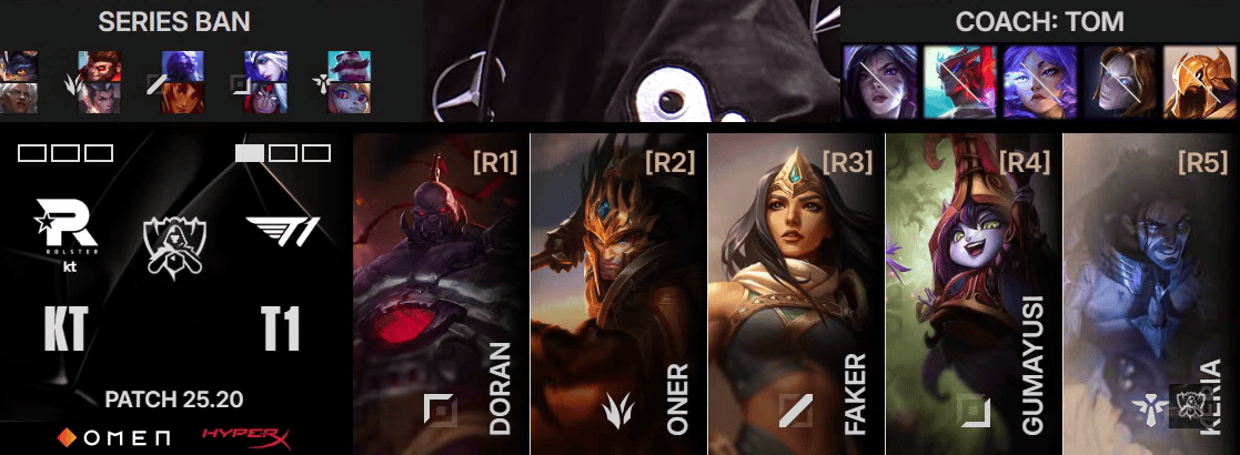 T1选用:Doran塞恩、Oner皇子、Faker塞拉斯、Gumayusi希维尔、Keria璐璐
