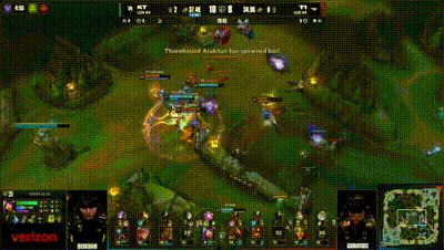 比赛第34分钟,Faker塞拉斯在野区率先被秒,KT一波打出0换3拿到大龙。将经济差距拉开到9k。