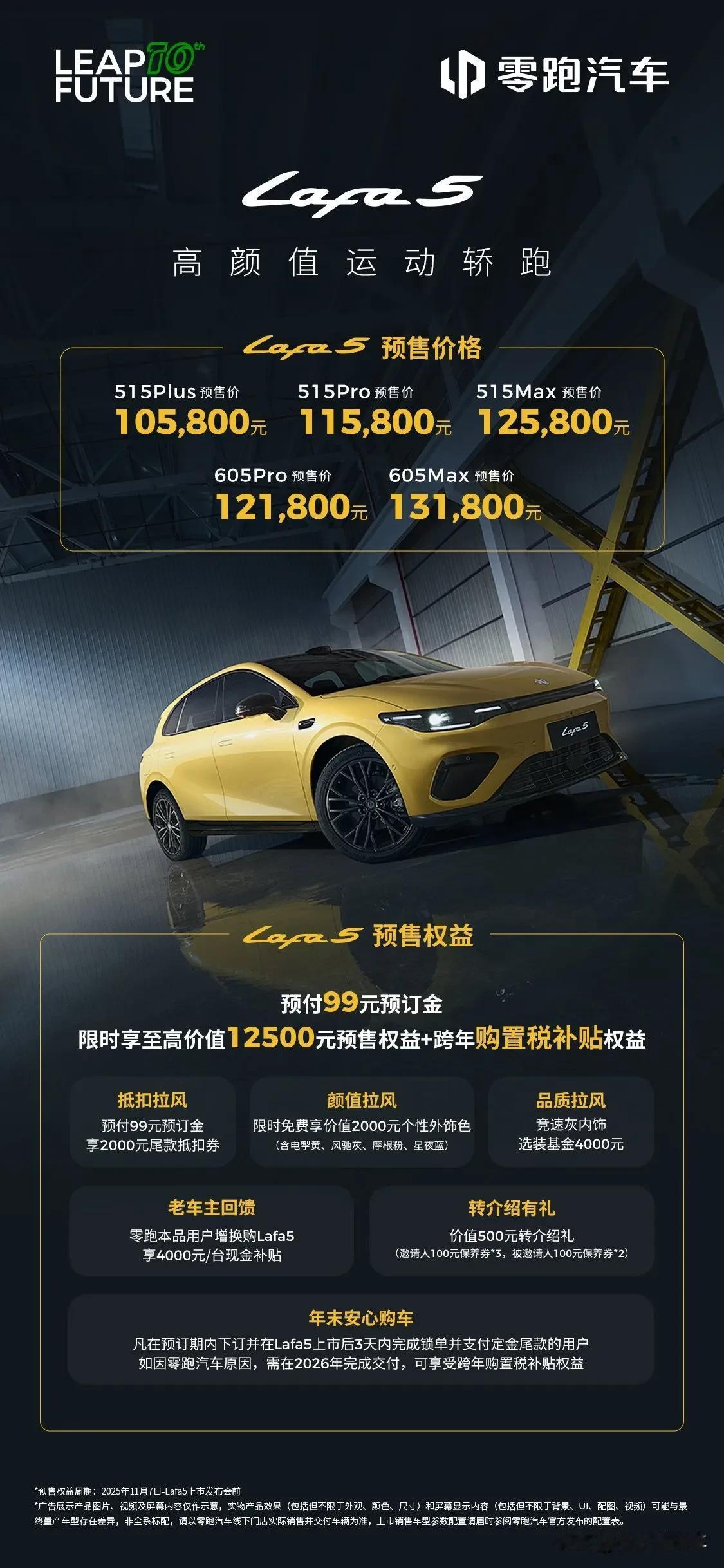 预售10万起,配8295芯片+激光雷达还有605km超长续航,就这也能喷? 11月7日,零跑Lafa5迎来预售,当我看到10.58万起的预售价格时,第一反应就是:零跑又掀桌子了。不过我也看到网上对这款车有不少非议,对此我只能说“人红是非多”。 相信大家对于零跑汽车现阶段的成绩都不陌生,今年开始,零跑已经连续8个月拿下新势力月销第一,并且零跑在10月份创造了单月交付超7万台的纪录,这不仅是零跑的突破,也是新势力阵营头一次。眼瞅今年就要过完了,意味着年度销冠大概率也非零跑莫属。所以现在零跑已经成为友商追赶的头号目标,那一推出新车,网上就出现这么多争议,我觉得也不意外。 但不管网上怎么喷,从Lafa5的产品力就能看出,它依然延续了零跑好而不贵的品质。比如纯电续航至高可达605km,给到8295芯片和激光雷达等硬件,这意味着无论是追求实用性还是智能化体验的年轻消费者都能够得到满足。 其实Lafa5预售价比当时B10的预售价都更低,因此我相信争议归争议,零跑Lafa5最终应该还是能够凭借精准的市场定位和越级配置,吸引真正的用户,也打破这些争议。