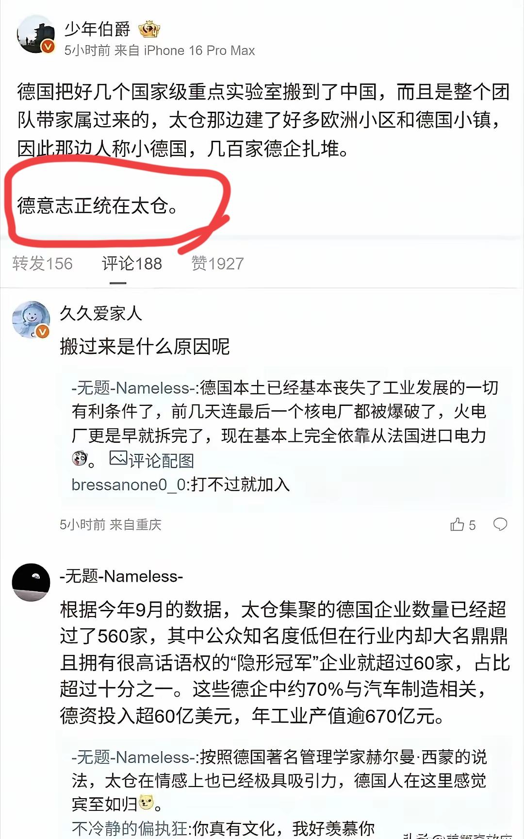 德国自从红绿灯🚥拆了之后,整个人就精神多了。天天变着花样给中国找不愉快。这到底是为啥啊? 在经济政策上,在外交场合,甚至搞不清楚自己身份在台湾问题上也指手画脚和台独分子狼狈为奸。结果外长两次想访华都被甩了脸子。 我记得默大妈在台上的时候,她可是十年来八回中国,九过小日子而不入啊。气的安倍差点破口大骂了。 这默大妈一退休,德国的精神小伙默茨把红绿灯一拆,完全放飞自我了。 这到底这啥? 直到我看到了图三。 现在德意志的正统来到了太仓,那里就留给那些白左和移民玩吧。 难怪玩得这么花。 点右上角关注我,我们一起去看这个魔幻的世界