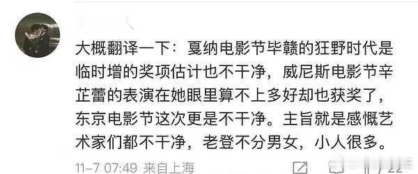 辛芷蕾这波回应太漂亮了!面对"靠资本运作奖项"的质疑,她没怼人也没装哑巴,三句话就把黑粉怼得没脾气。 能运作的话,我咋等了14年才拿威尼斯影后?为啥是我不是别人?直接戳破谣言——威尼斯影奖82年历史,华语圈才3个影后,要真能运作,内娱早人手一个奖杯了! 这波操作既体面又有文化,比那些只会骂街的强多了。现在网络喷子张口就来,也不想想逻辑。辛芷蕾用事实说话,既维护了尊严,又给造谣者上了一课。真心希望少点这种无脑黑,让认真演戏的演员能好好工作。
