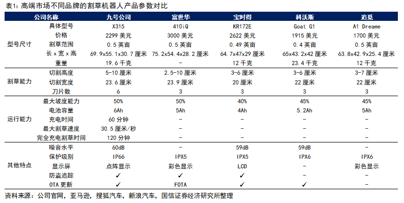 高端市场上九号的割草机器人在割草能力、充电能力及防护性方面有领先优势,具备较强竞争力。对比九号及其他竞争对手的割草机器人相关参数,九号割草机器人领先优势体现在:1)割草能力较强:九号割草机器人的切割高度5-10厘米,切割宽度23.6厘米,其他竞品割草机器人的切割高度在3-6厘米左右,切割宽度基本小于九号,因此九号在切割宽度、高度选择方面更灵活;九号采用6刀片,行业中普遍为3刀片配置,割草能力较强;2)电池容量更大:九号X315型号电池容量为6Ah,竞品割草机器人的电池容量一般在5.2Ah以内,九号割草机器人的电池容量更大;3)保护级别较高:九号割草机器人的保护级别为IP66,防尘性及防水性较强,竞品防护等级为IPX6或者IPX5,仅在防水性方面有一定等级要求;4)相较于部分头部割草机器人公司有价格优势:九号割草机器人相较于富世华、宝时得等头部企业,定价上便宜12%-23%左右范围,具备一定价格优势。
