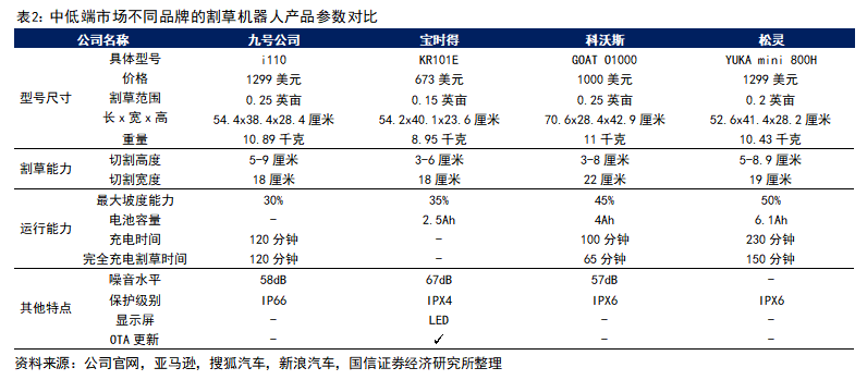 针对中低端市场九号推出i系列产品,对比i110及其他竞品,i110优势主要体现在:1)较低的噪音水平:i系列的噪音水平在58dB,相对行业中其他竞品较低,2)较高的保护级别:i系列的保护级别在IP66,防尘性及防水性较强,科沃斯、松灵、宝时得产品的保护性较弱,3)边缘切割能力较强:i系列利用人工智能技术识别草坪边缘,用户能够轻松进行修改和微调,以最大程度地适用花园场景和自身割草需求;新增割草模式、跨骑模式等能够解决草坪边缘割不到草的问题,提高割草效率。从定价层面看,i系列定价1299美元,定价相较于国内其他竞品接近。