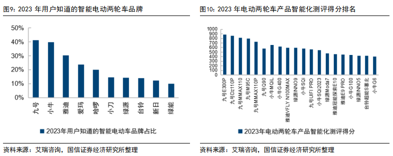 九号在消费者心中树立智能化、高端的品牌形象。凭借九号公司专利、技术等方面的储备及产品布局,公司多款车型在智能化测评中居于前列,例如E300P、Dz110P、MMAX110等,领先于行业中其他电动两轮车品牌;根据艾瑞咨询,消费者对九号的智能化特点也有更强的认知度,用户认知中九号、小牛是最先想到的智能电动车品牌,九号的认知比例达41.2%,居于电动两轮车行业各品牌首位。