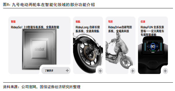 公司在智能化领域持续迭代升级。2019年九号发布真智能1.0系统,主要包含感应解锁、RideyGo!即停即走系统、驻车感应及座椅检测系统、三重定位系统、自主研发锂电智能BMS、OTA升级等功能;2021年公司发布真智能2.0系统,实现功能及技术升级,相较于真智能1.0,真智能2.0包含RideyGo!2.0系统、RideyFun智控系统、鼹鼠控MoleDrive全新自研控制器等,新增家庭账号等功能;2025年九号发布真智能3.0系统,3.0时代新增NinebotSIGHT视觉辅助系统、NinebotESP车身稳定系统,推出全新升级的鼹鼠控MoleDrive2.0等,进一步打造行业领先的智能出行解决方案。