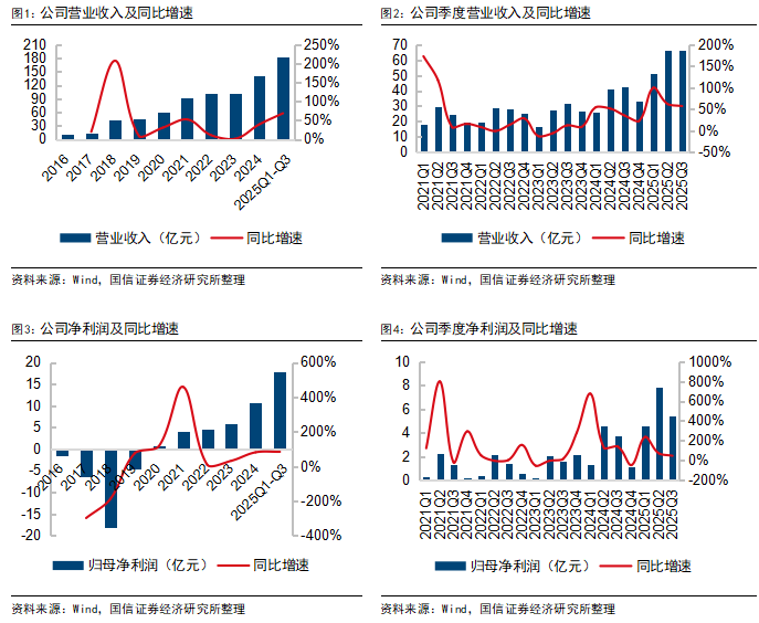 九号公司2025Q1-Q3营业收入183.9亿元,同比增长68.6%,2025Q3营业收入66.5亿元,同比增长56.8%,环比增长0.3%;2025Q1-Q3净利润17.9亿元,同比增长84.3%,2025Q3净利润5.5亿元,同比增长45.9%,环比下降30.6%,受益于电动两轮车、割草机、全地形车等较快放量,收入及净利润持续改善。