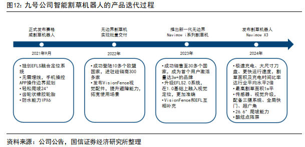 九号割草机产品矩阵不断丰富,对原有产品进行技术升级。2021年9月公司正式发布赛格威割草机器人Navimow,2022年实现批量交付,并在2022年进驻经销商300多家,2023年公司推出新一代无边界割草机Navimowi系列新品,2024年公司再次对产品进行升级,发布NavimowX3系列新品。