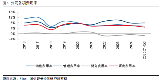 2025Q1-Q3综合费用率同比下降。销量提升产生规模效应,促进费用率下降,2025Q1-Q3销售费用率7.9%,同比下降1.4pct,管理费用率5.5%,同比增长0.1pct,研发费用率4.7%,同比下降0.3pct,财务费用率-1.5%,同比下降0.9pct,销售、研发及财务费用率同比下降,主要由于收入提升产生规模效应,公司综合费用率16.6%,同比下降2.4pct。