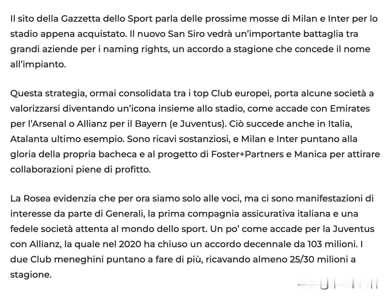 AC米兰与国际比赛正在争夺圣西罗球场的冠名权!AC米兰和国际米兰都寄希望于自身的荣誉簿以及福斯特建筑事务所和马尼卡的项目,以吸引更多盈利的合作伙伴。据说是双方都希望利益最大化,都想在球场层面获得更多的受益,我理解的这个争夺可能还是赞助商选择问题,大家既然都看重利益那就利益最大化,直接卖了冠名权就是了,有啥可争夺的。 新球场的冠名权之争将在各大公司之间展开,这项为期一个赛季的协议将决定球场的冠名权归属。 个人没理解一点,这个冠名权是不是应该是双方的?毕竟球场是双方的,不能说谁争夺就是谁的,那争夺标准呢?如上面说的按荣誉来评估,那不是争夺,那就是给米兰,除了皇家马德里有谁有资格和米兰谈荣誉。或者按球队历史说也行,建队是先有的AC米兰,然后才有国际米兰,米兰永远都大气,建议一个球队出2字,我们就出AC,国际米兰出米兰,新球场就叫AC米兰大球场,咱们吃点亏就吃点亏。