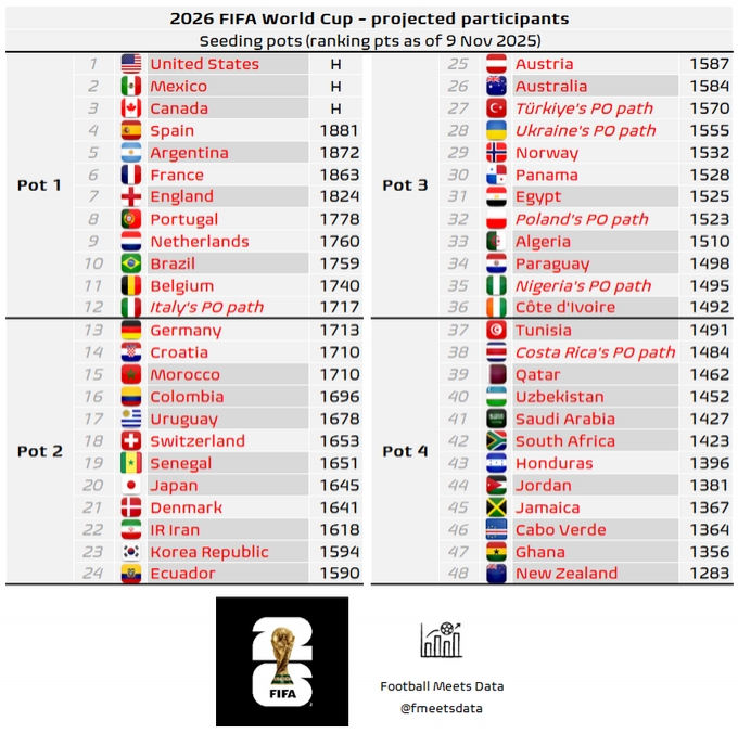直播吧11月09日讯据外媒FootballMeetsData报道,国际足联(FIFA)将改变通过附加赛晋级2026年世界杯的球队分档原则!