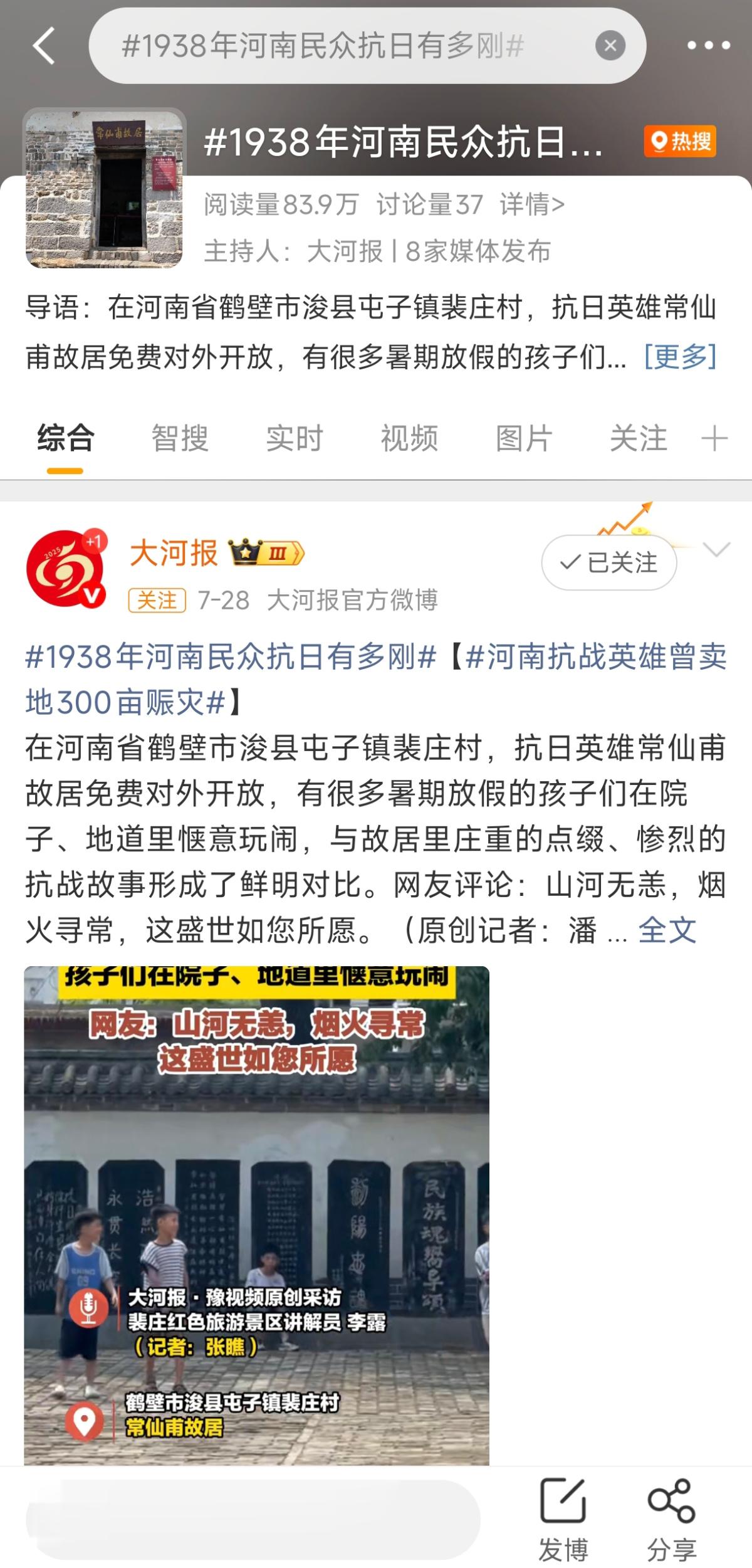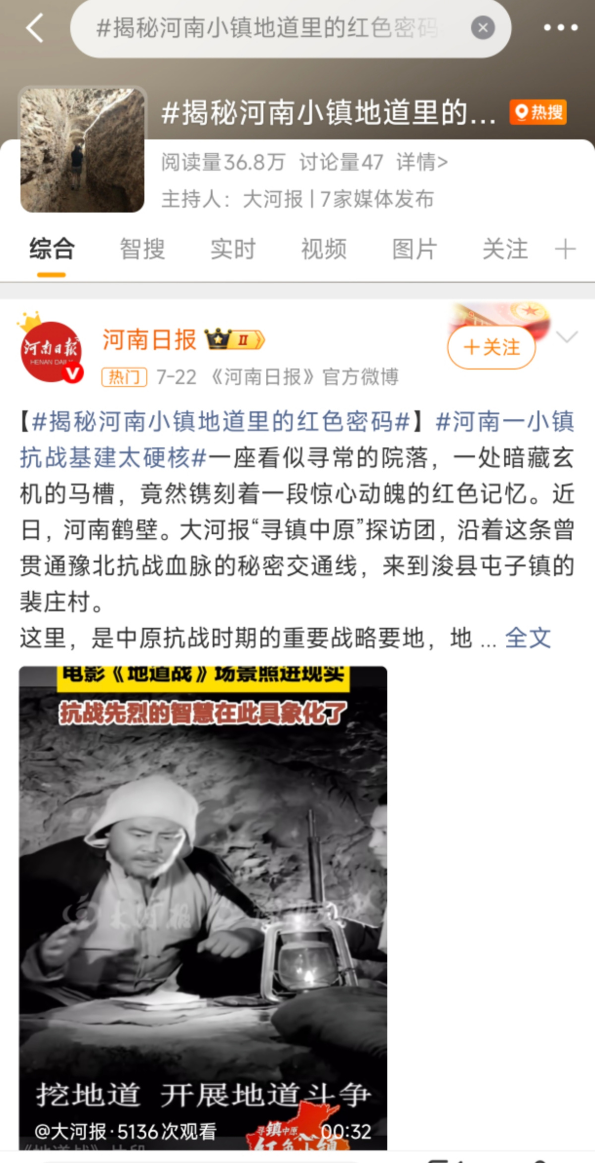 值得一提的是,大河报“红色小镇”系列报道还多次登上微博热榜。其中#河南一小镇抗战基建太硬核##揭秘河南小镇地道里的红色密码#均登上微博郑州同城榜,微博话题阅读量近100万;话题#1938年河南民众抗日有多刚##河南抗战英雄曾卖地300亩赈灾##改写豫北战局的“神级”堡垒”等多条话题阅读量70万左右。该系列报道全网传播量累计800万+,正能量澎湃出大流量。
