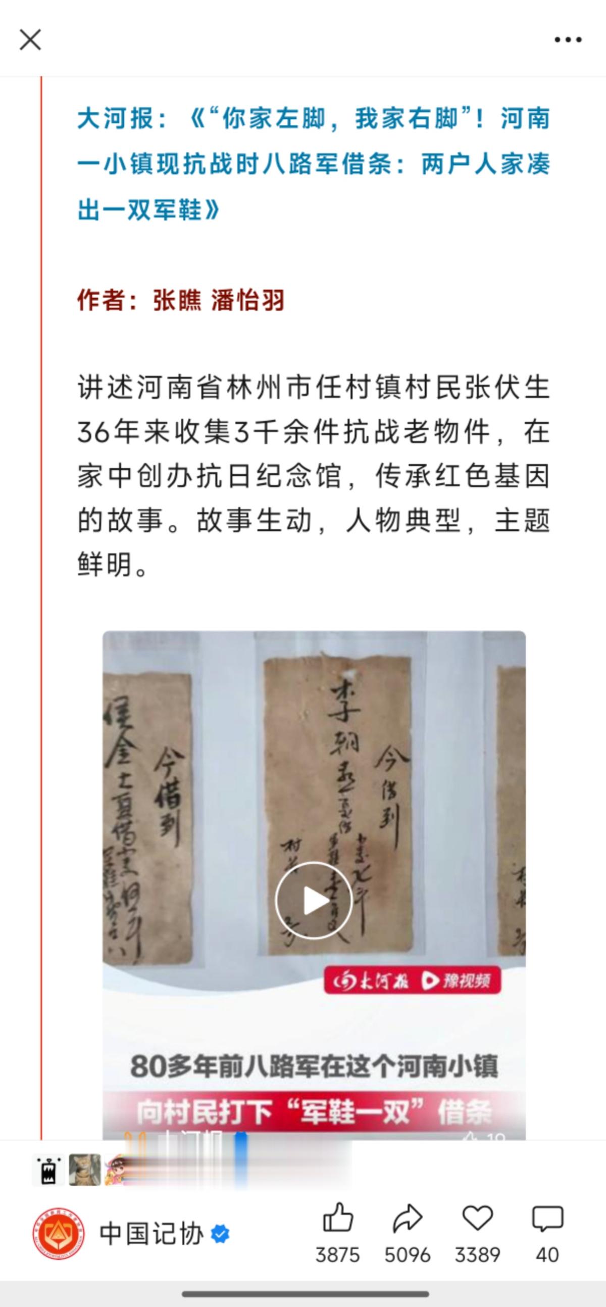 今年9月1日,大河报“红色小镇”系列报道中的《“你家左脚,我家右脚”!河南一小镇现抗战时八路军借条:两户人家凑出一双军鞋》一篇报道,入选中国记协“我的代表作”栏目。