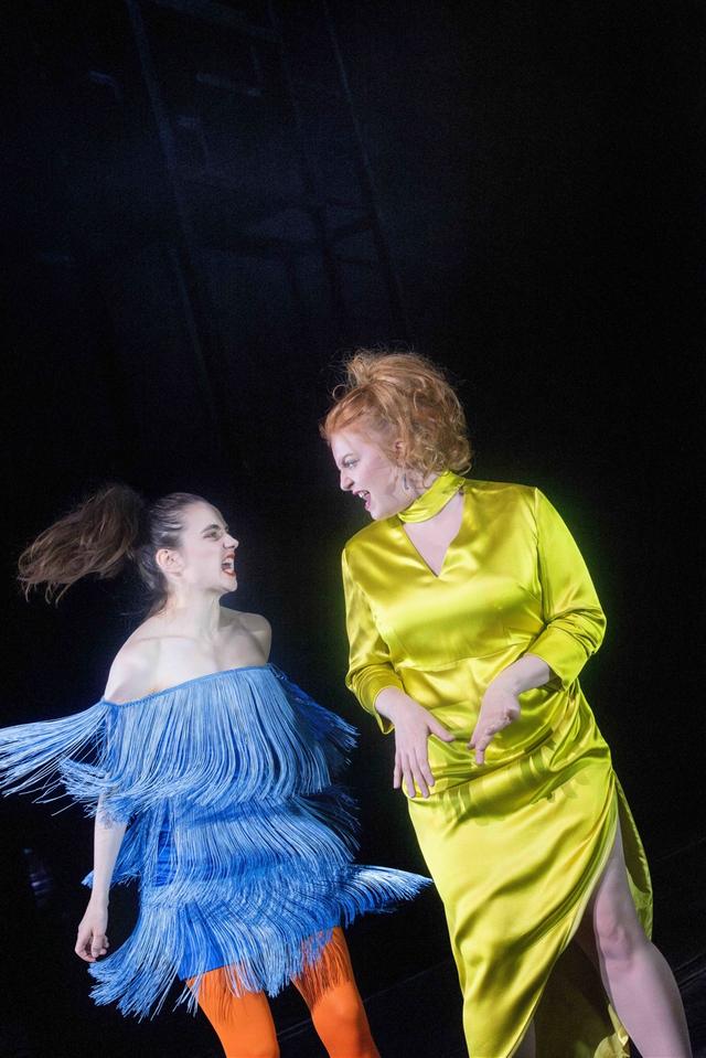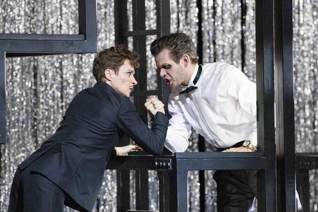 巴里·科斯基曾带着综合默剧、动画、歌舞剧的《魔笛》于2015年亮相上海大剧院。在《三分钱歌剧》,巴里·科斯基提醒演员可以随时打破第四面墙,鼓励演员用滑稽剧形式演绎该剧,语速快,机智幽默,又充满轻松的氛围。收受贿赂的警察局长布朗一角,由女演员约瑟芬·普拉特贴着小胡子反串出演,这一设置也让布莱希特的“间离效果”在舞台上微妙地发酵。冷硬的金属把舞台变为成像迷宫、格子间、脚手架的大型空间,展现“在老鼠窝里腐烂”的气息。演员们在脚手架上下灵活攀爬,直观体验人物为了生存而必须不断往上爬。