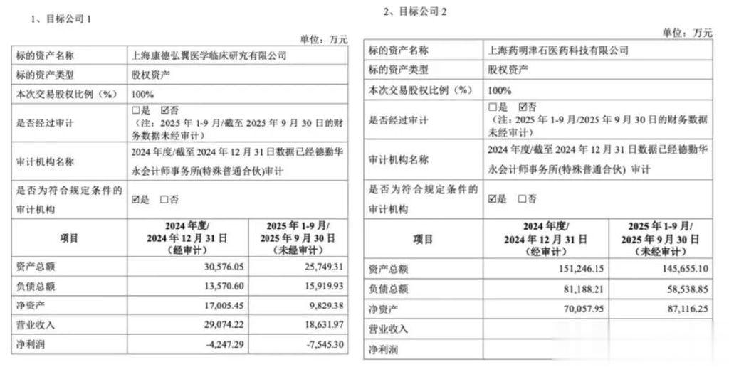 两家公司在2025年前三季度合计收入11.65亿元,占集团营收3.55%,合并净利润0.86亿元,占同期利润0.72%。其中,康德弘翼亏损7545万元,药明津石盈利1.62亿元。