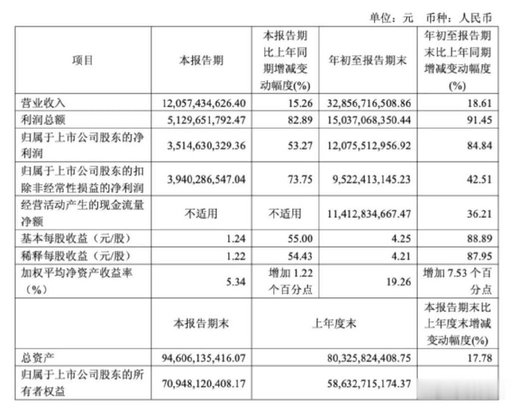 利润端表现更为突出,前三季度归属于母公司股东的净利润为120.8亿元,同比增长84.8%。
