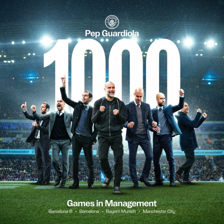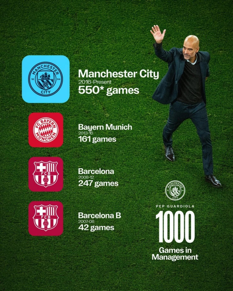 执教生涯此前的999场比赛,瓜迪奥拉取得了715胜156平128负的战绩,胜率超过7成。