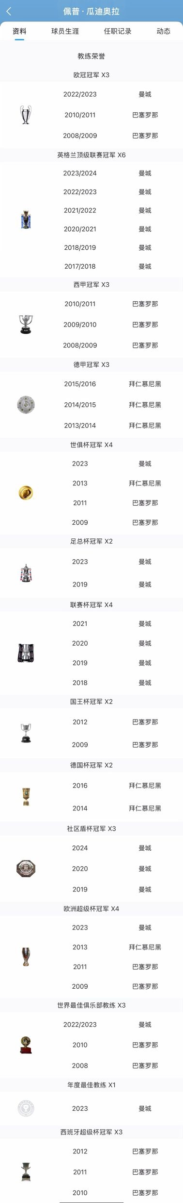 瓜迪奥拉执教生涯主要荣誉一览↓