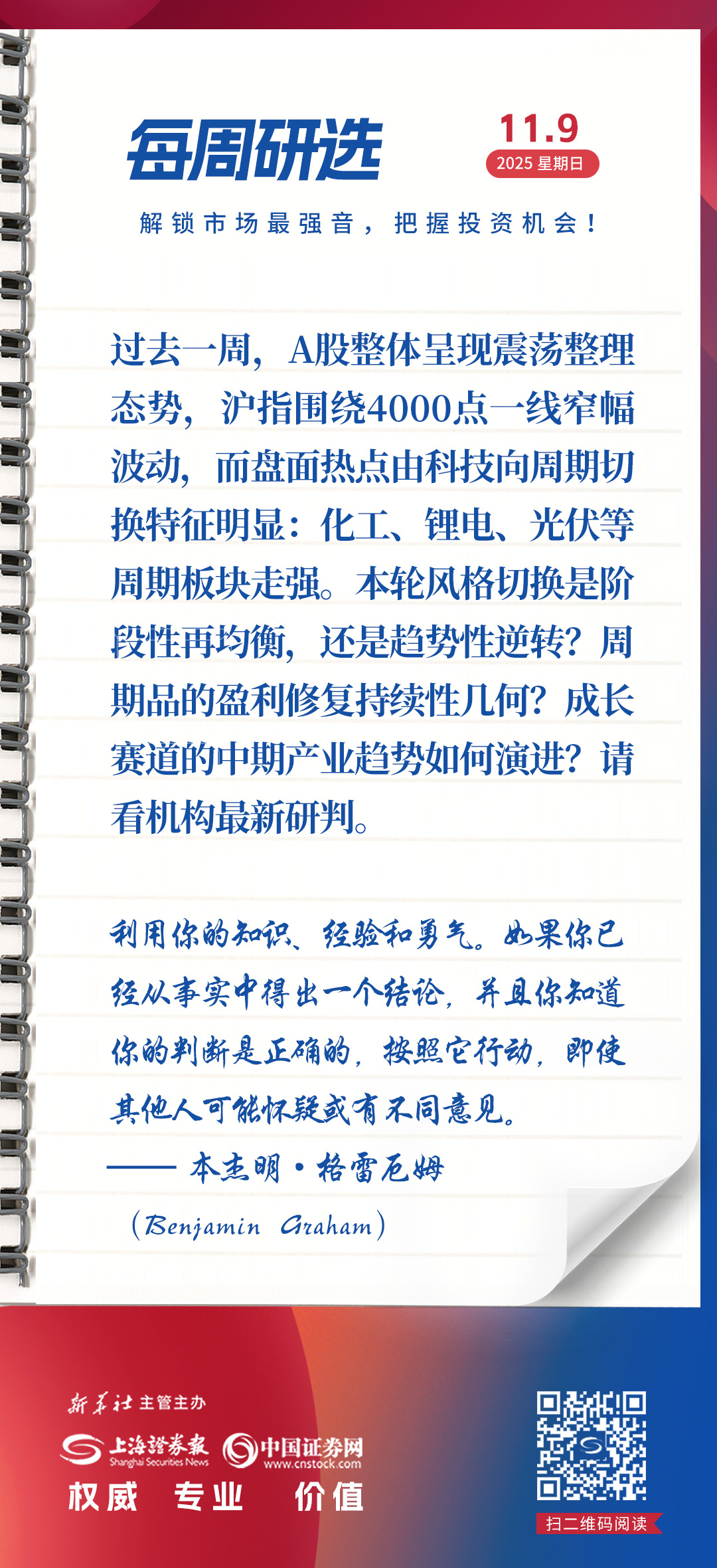 上证报中国证券网讯(记者汪友若)过去一周,A股整体呈现震荡整理态势,沪指围绕4000点一线窄幅波动,而盘面热点由科技向周期切换特征明显:化工、锂电、光伏等周期板块走强。本轮风格切换是阶段性再均衡,还是趋势性逆转?周期品的盈利修复持续性几何?成长赛道的中期产业趋势如何演进?请看机构最新研判。