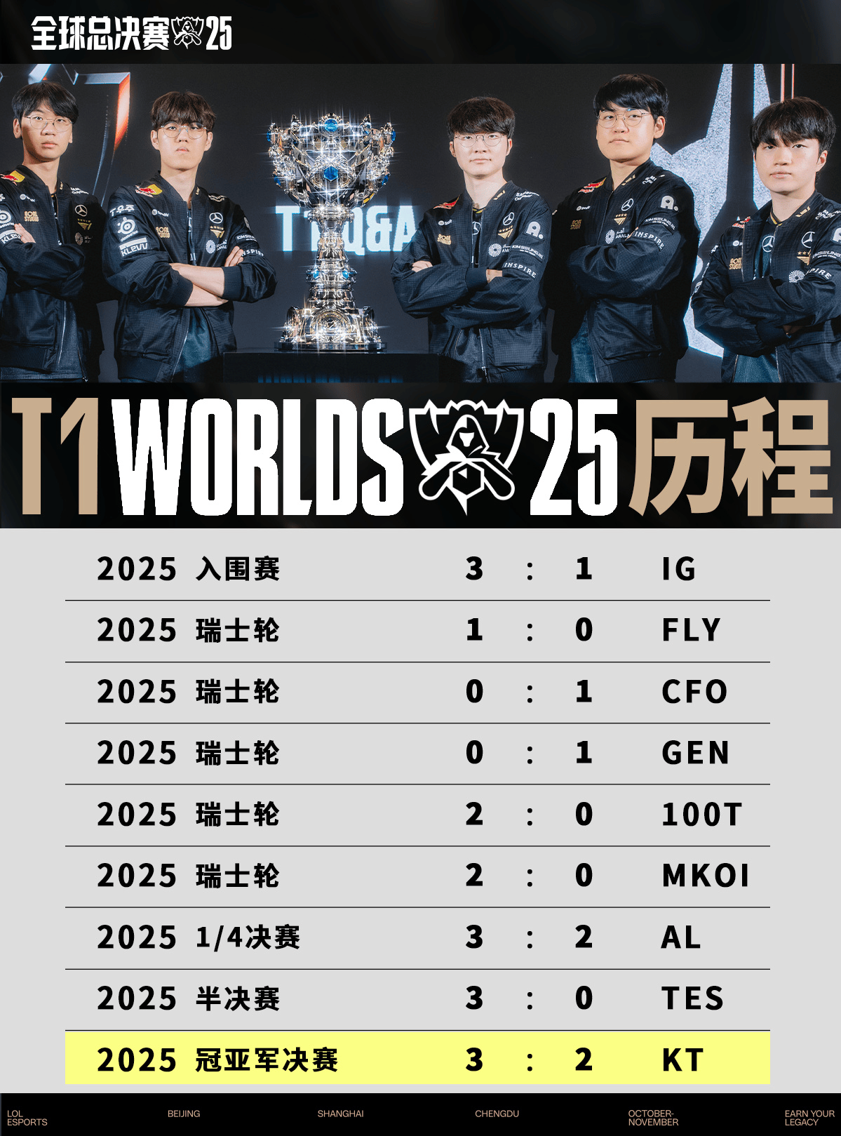 T1历经9场对决,最终拿下2025全球总决赛冠军,达成三连冠成就,恭喜T1!
