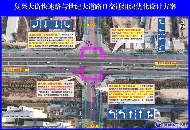 为保障复兴大街辅道车辆与世纪大道车辆,实现不受灯控限制的顺畅转换,结合交通流量大小优化车道属性。北进口由原“1左转+2直行+1直右”调整为“1左转+2直行+1右转”,方便北向西右转车辆快速驶入复兴大街快速路。东进口由原“2左转+1直行+1直右”调整为“1左转+2直行+1右转”,提升东向北右转车辆进入世纪大道的通行效率。