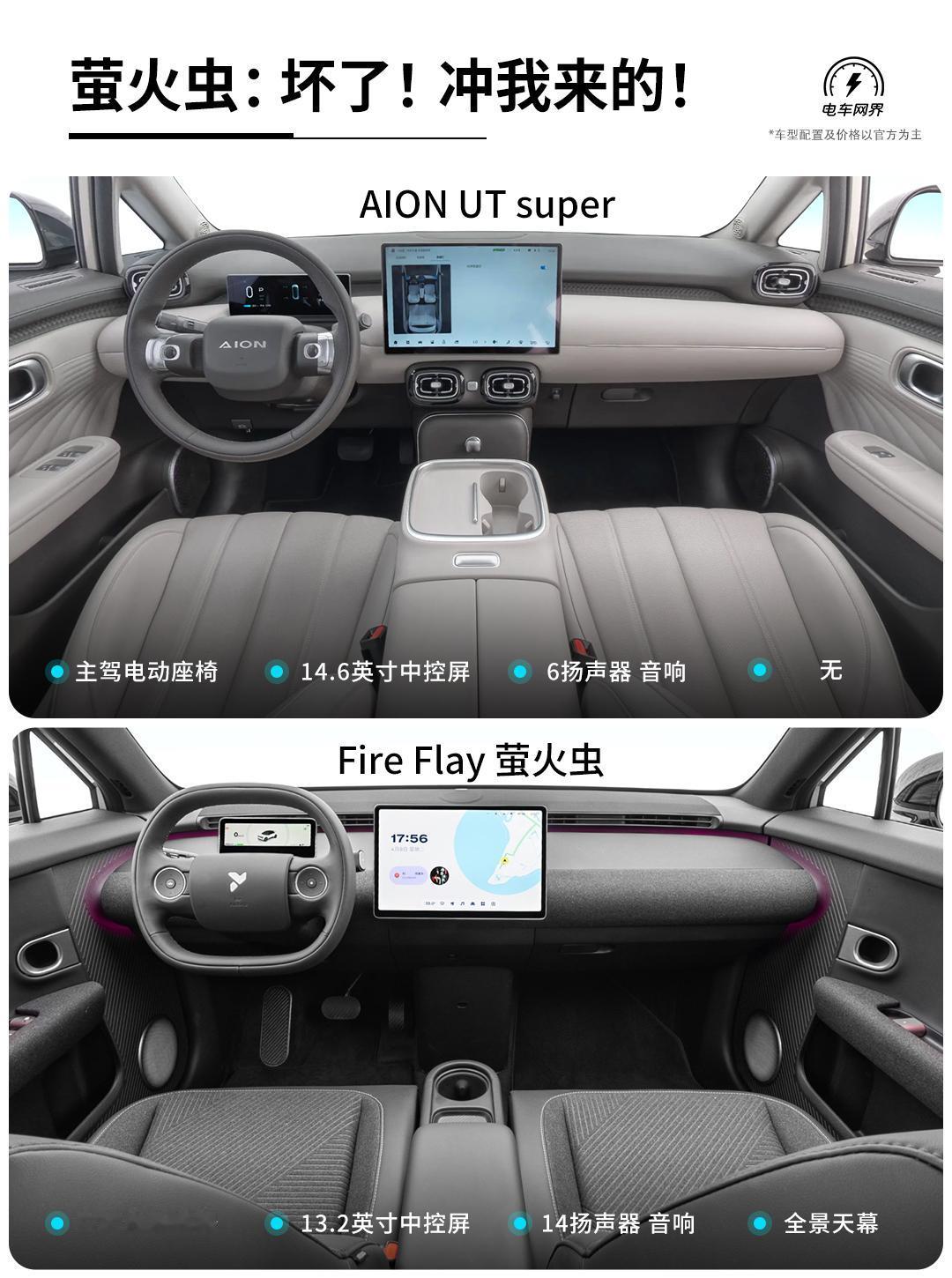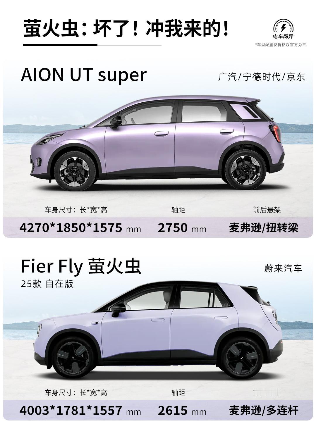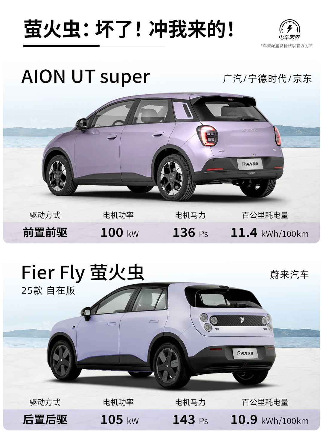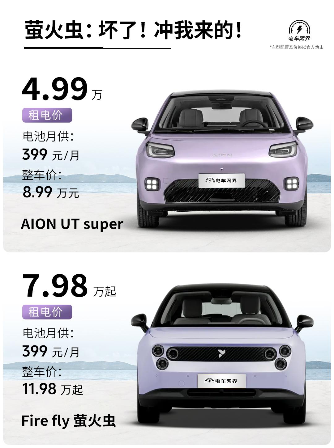 广汽、宁王和京东联合打造的 AION UT super上市了(埃安UT的换电版),租电价4.99万起,整车价8.99万元。我第一时间想到的就是能对蔚来萤火虫购车威胁吗?咱们不妨一起看看这款新车具体什么实力。 AION UT super目前就一个版本,标配了宁德时代的巧克力电池,纯电续航500km,据说只需要99秒就可以完成换电。动力部分采用100kW功率的电机,最大马力136匹。配置部分有电动尾门、自动感应雨刮、胎压监测、三种驾驶模式切换、定速巡航、540度全景影像、14.6英寸中控屏、6扬声器音响、外后视镜加热等配置,基本可以满足日常需求。 蔚来萤火虫走的是精品小车路线,入门版本虽然续航才420km,但是在底盘、动力、配置上都要明显更有优势。 所以,如果你仅仅需要一款经济实用的代步电车,并且所在城市也有对应的换电站的话,那么选择租一个AION UT super 就足够了,399一个月的租金,十年也才48000元,也不用担心电池衰减。如果希望拥有一款个性时尚,对品质有要求的精品小车,那无疑萤火虫你会更喜欢。【来自懂车帝车友圈】