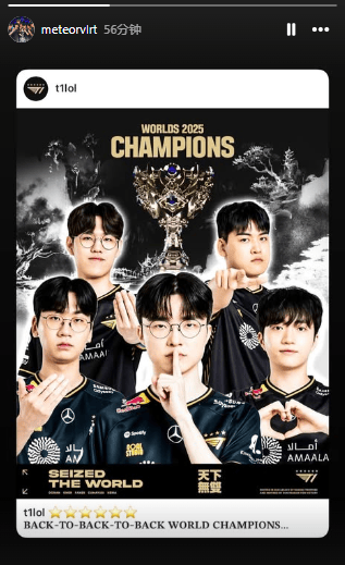 赛后,同为T1战队选手的Meteor转发T1夺冠海报。