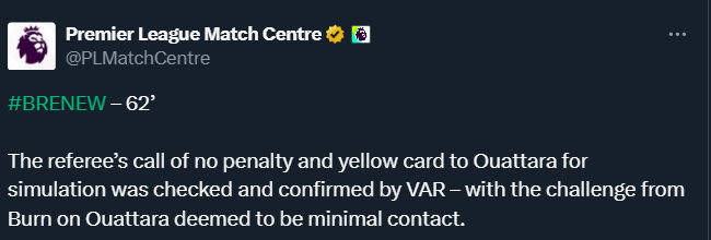 英超官方:裁判认为伯恩与瓦塔拉轻微接触,故不判点球