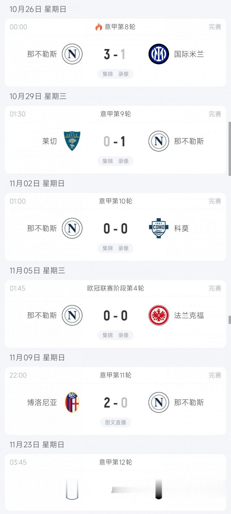 那不勒斯近期战绩↓