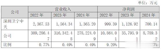 卫宁健康披露的数据显示,卫宁中天2022年至2024年营业收入分别为2367.53万元、1564.34万元和1365.20万元,占公司同期营收比例分别为0.77%、0.49%和0.49%,同期卫宁中天净利润分别为999.39万元、1126.92万元、700.14万元,占公司净利润比例分别为9.20%、3.15%、7.97%。
