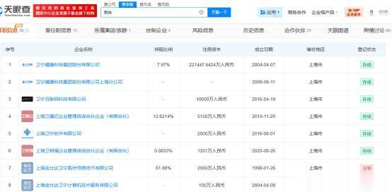 天眼查显示,截至目前,周炜担任卫宁健康、卫宁互联网科技有限公司、上海卫宁软件有限公司等6家公司法定代表人,涉及企业管理咨询、互联网,商务信息等行业。