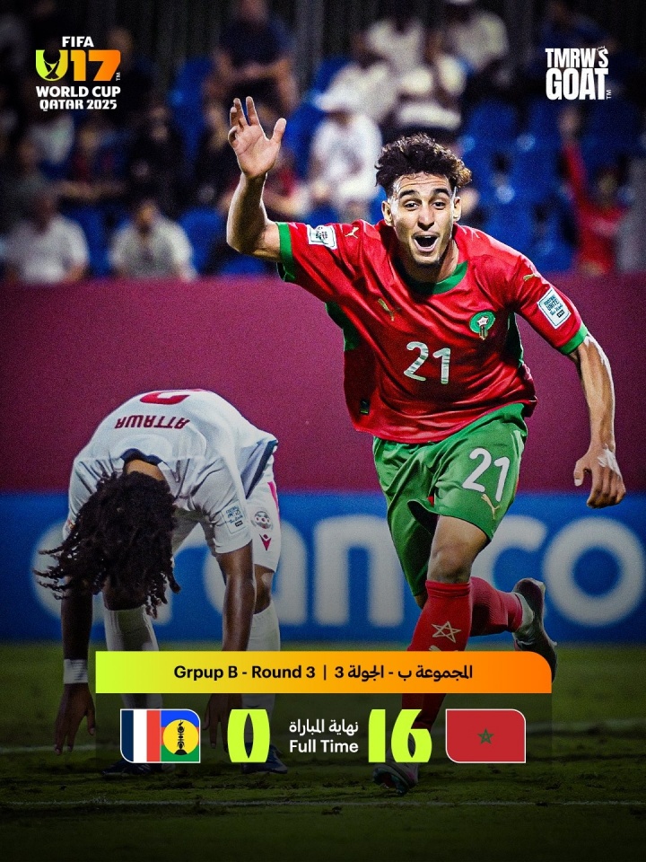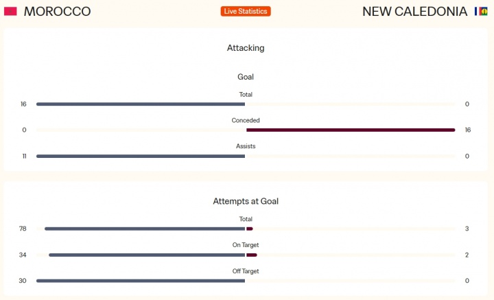 本场比赛新喀里多尼亚早早被罚下两人,第31分钟起就9人作战。摩洛哥U17上半场打入7球,下半场再入9球,全场狂轰78脚射门,最终16-0赢下了这场比赛。