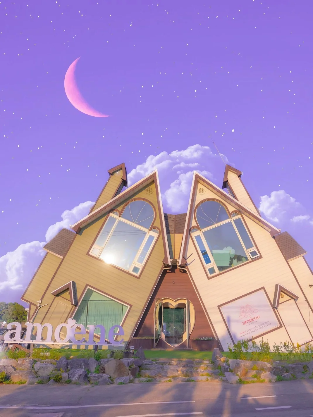 乍一看,Amoene Cafe 就像是从童话或卡通中走出来的,因为它就像两座相互靠在一起的房子。进门是一个心形的门,简直为情侣量身打造~走进咖啡厅,连窗户和门都是倾斜的 ,让人仿佛置身于爱丽丝梦游仙境的世界,当然地板是平坦的不用担心咖啡撒掉~