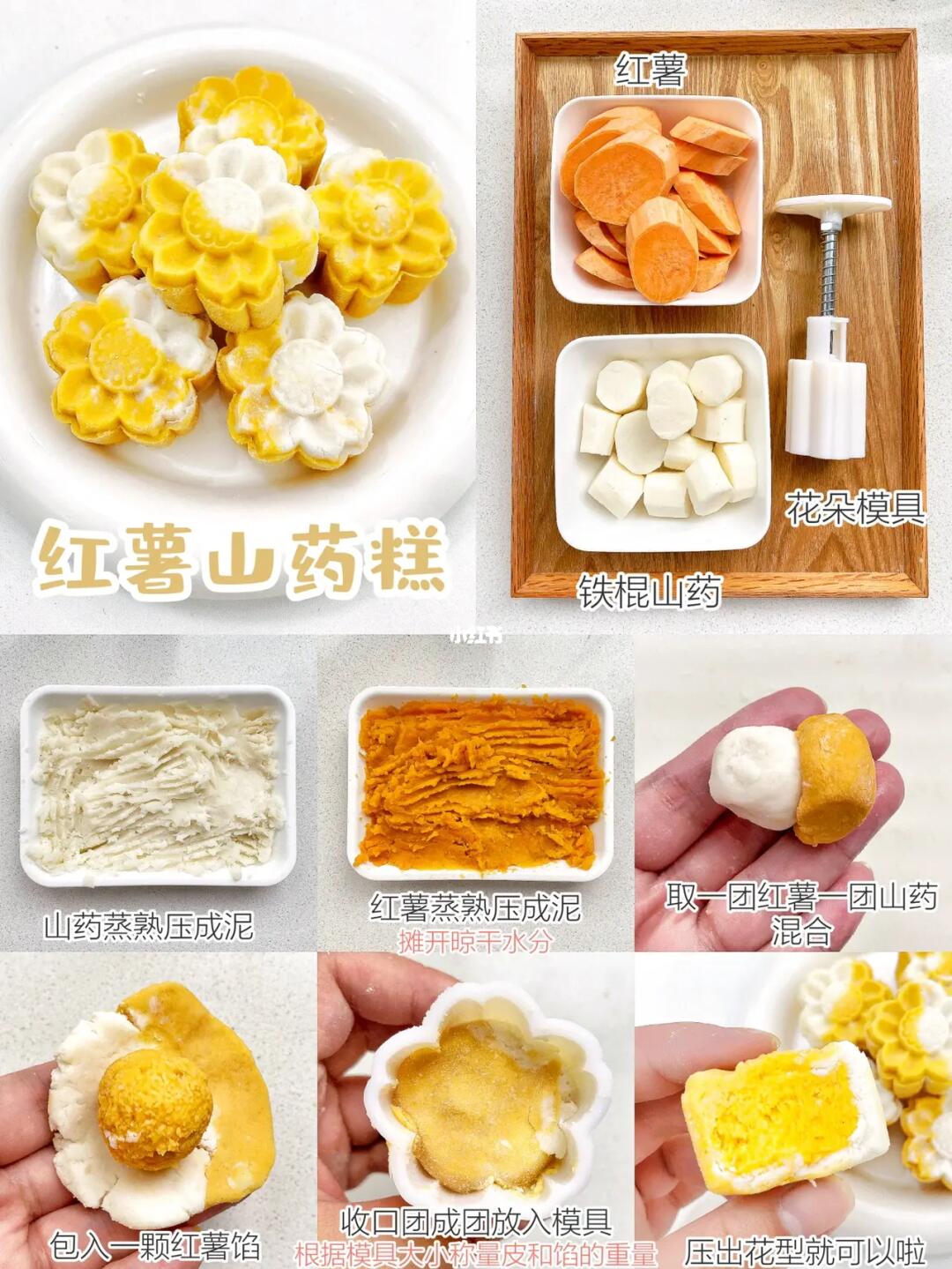 ▪️山药要选择含水量少的铁棍山药,蒸熟后趁热压成泥,再摊开晾干一下水分,这样捏起来更容易成型。如果你的山药含水量实在是多,可以加少量的熟糯米粉或者宝宝吃的米粉。