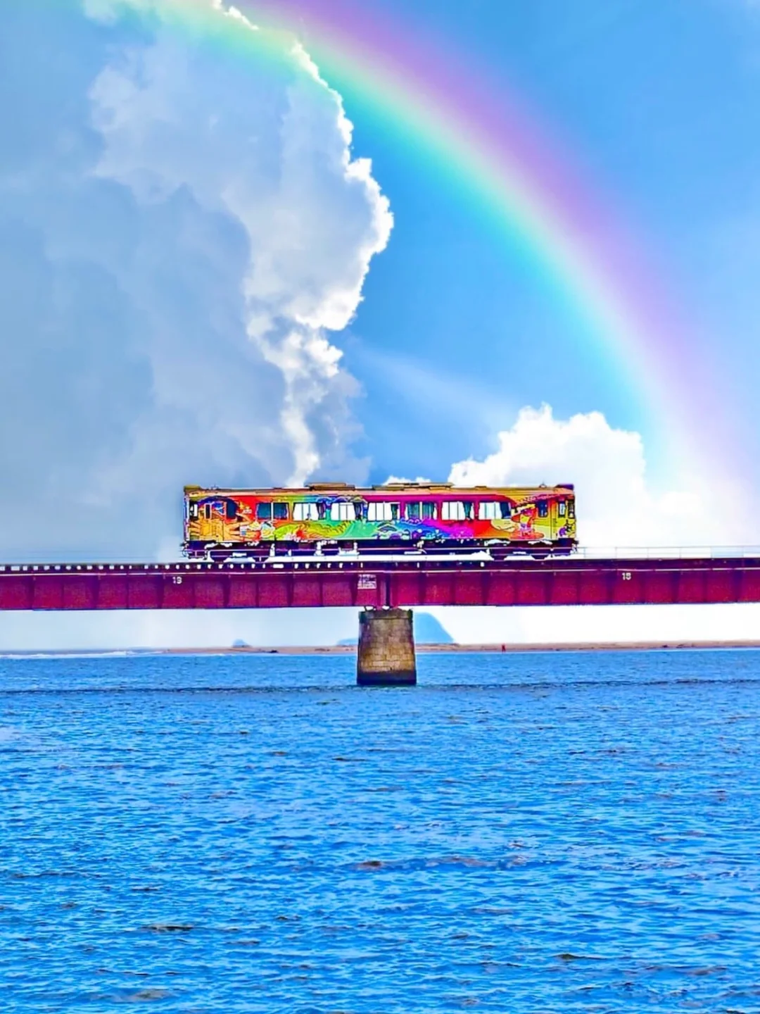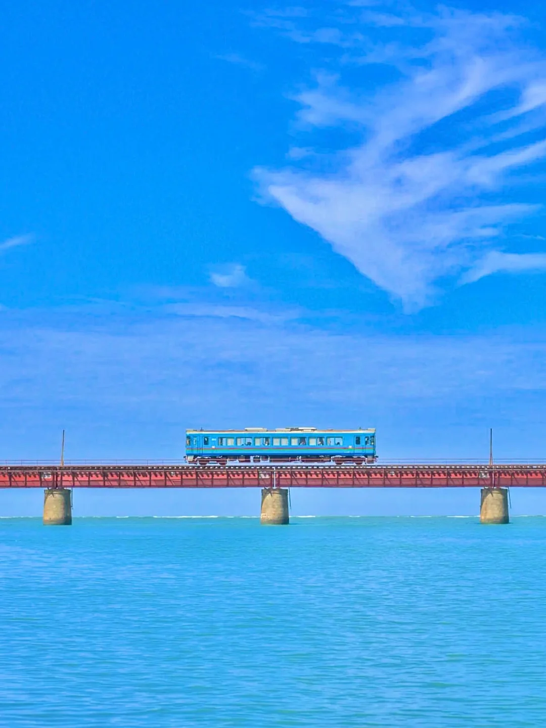 网上爆红的【由良川桥梁】小列车是京都府内最长的铁路桥。海天一色的背景加上显眼的丹后铁道观光列车,形成梦幻的对比~