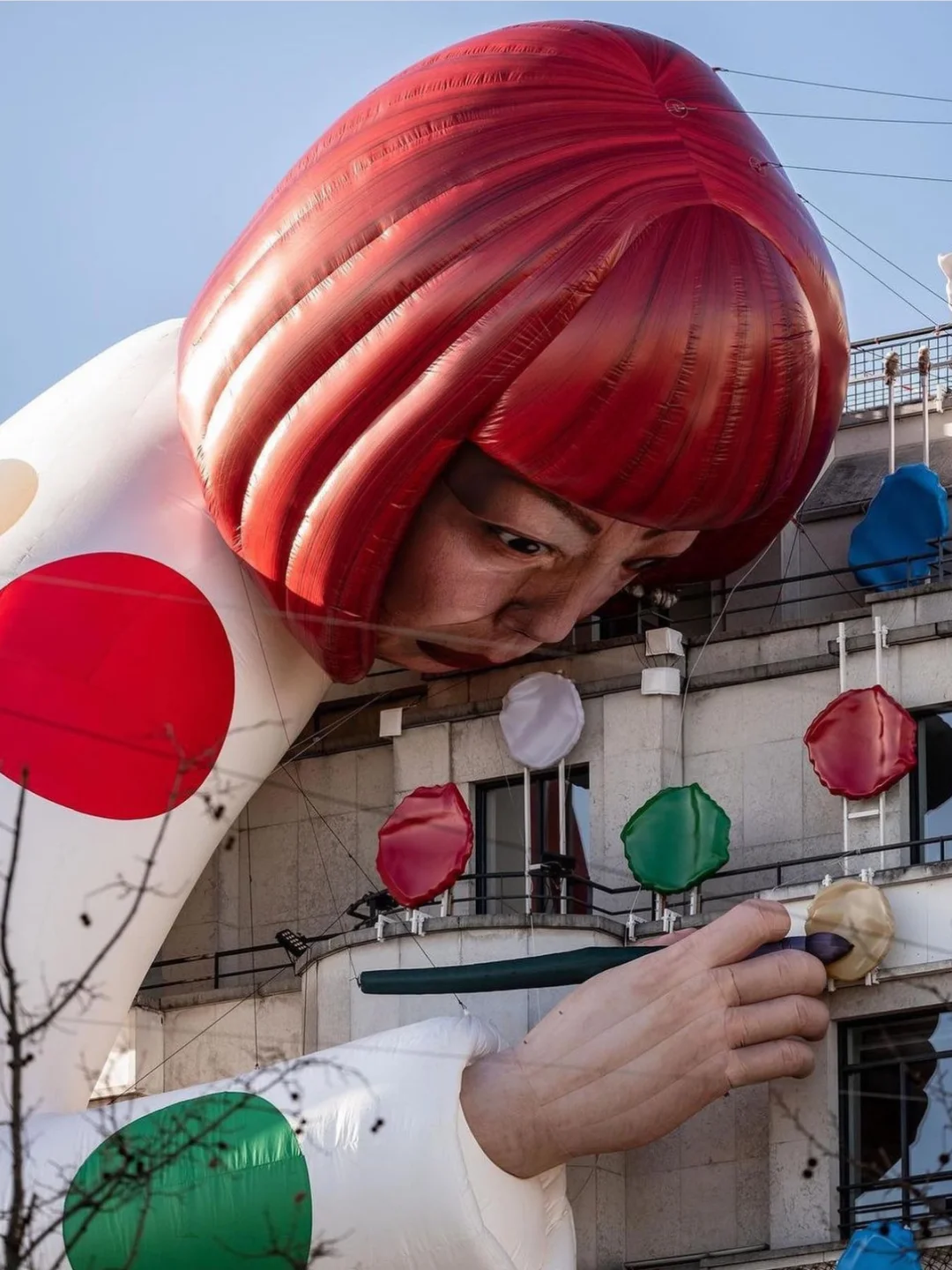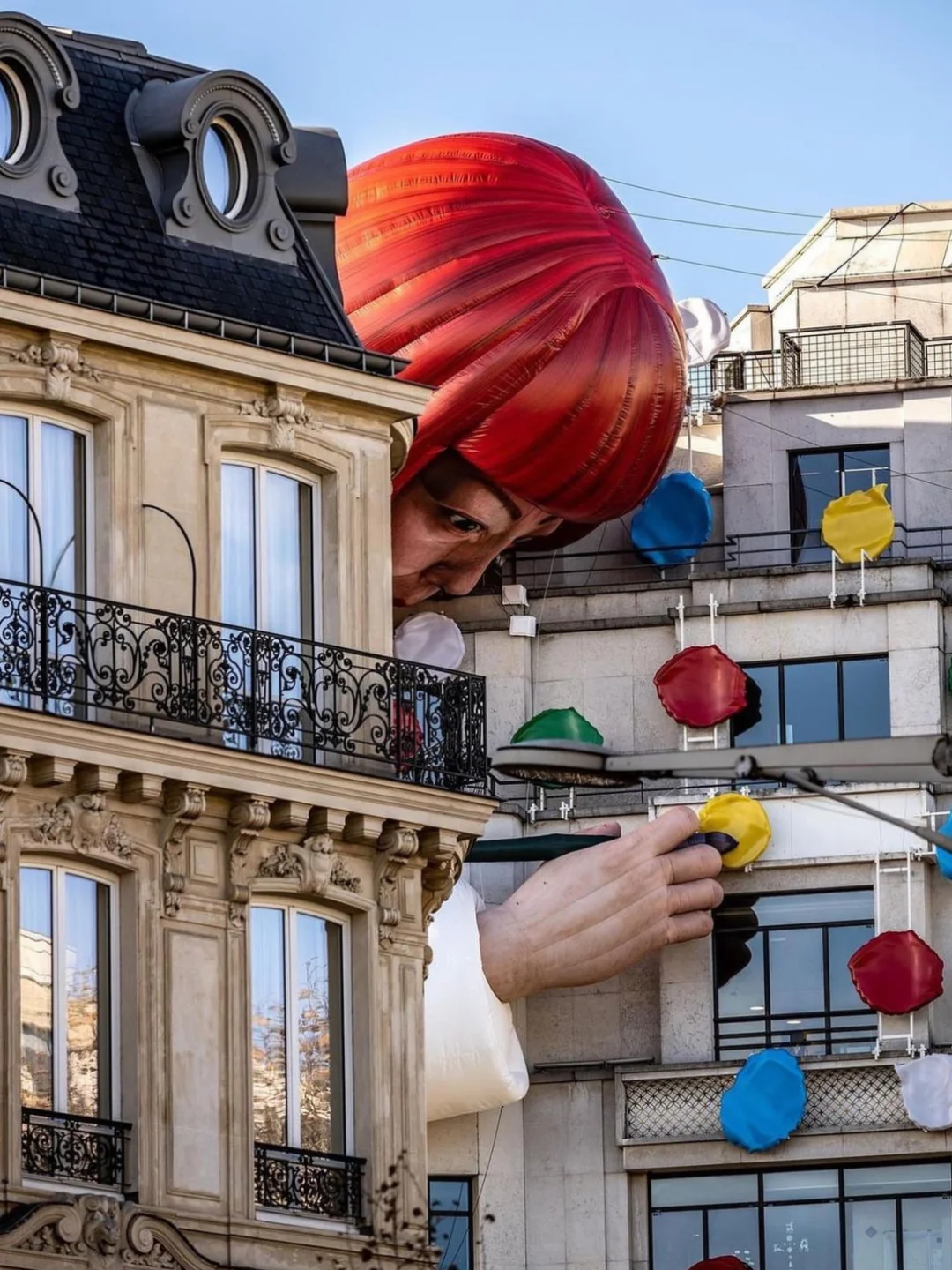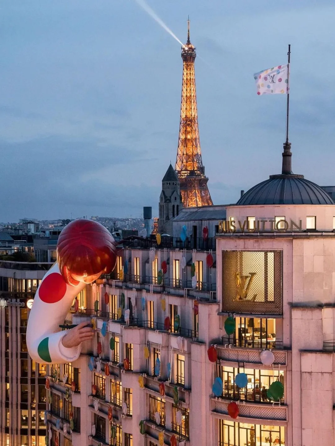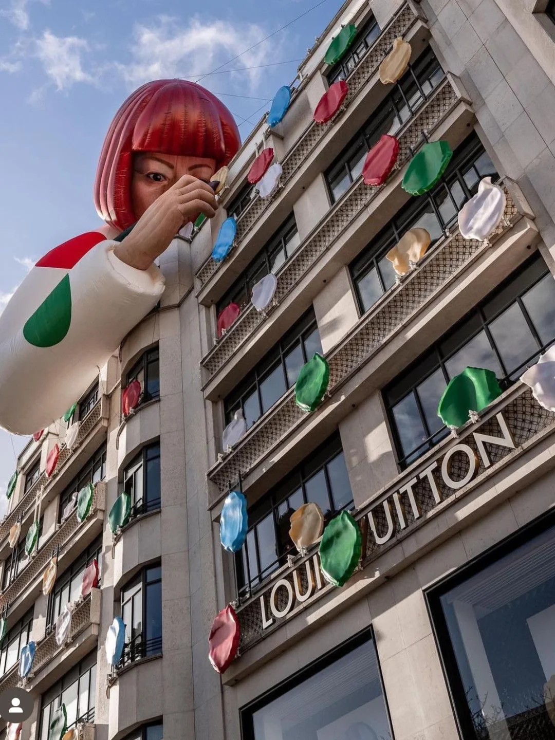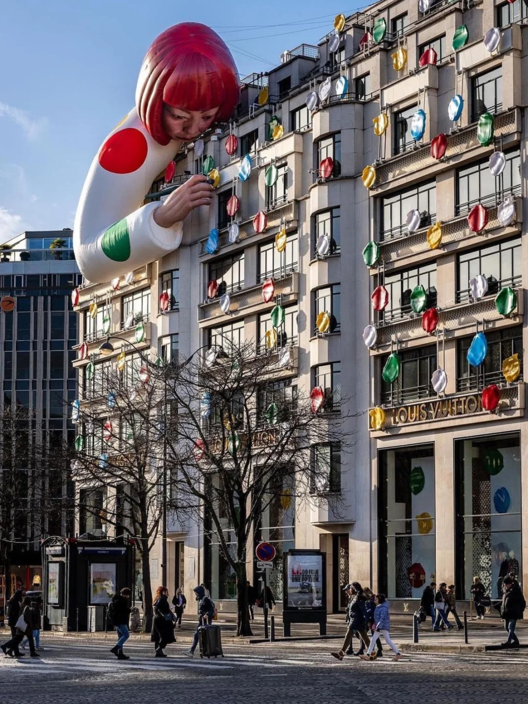 相信最近去香榭丽舍大街逛街的小伙伴们,在靠近LV旗舰店时,一抬头绝对会被下一哆嗦😂,LV大楼上,竟然趴了个巨人!