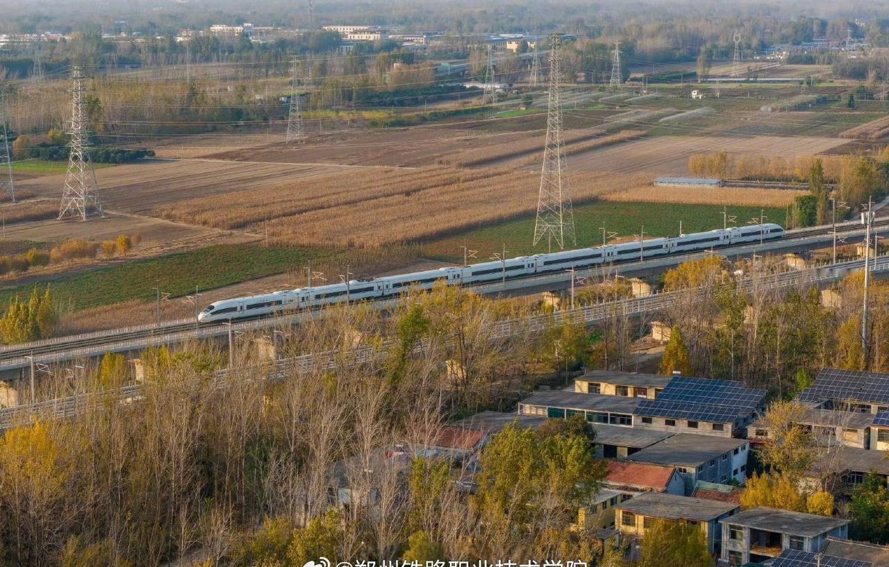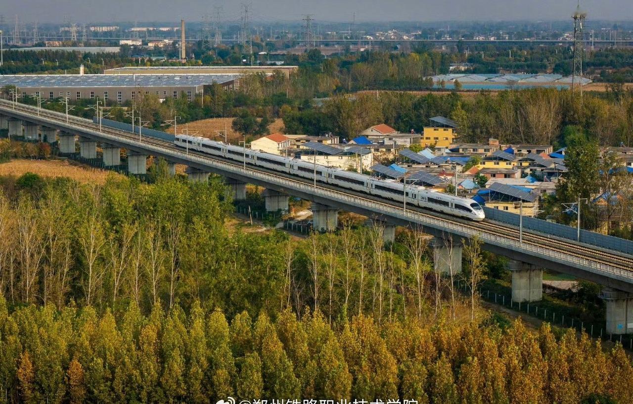 高铁如银龙穿梭于金黄树影间,在这片橙黄交织的画布上,勾勒出一道灵动的铁路风景线,