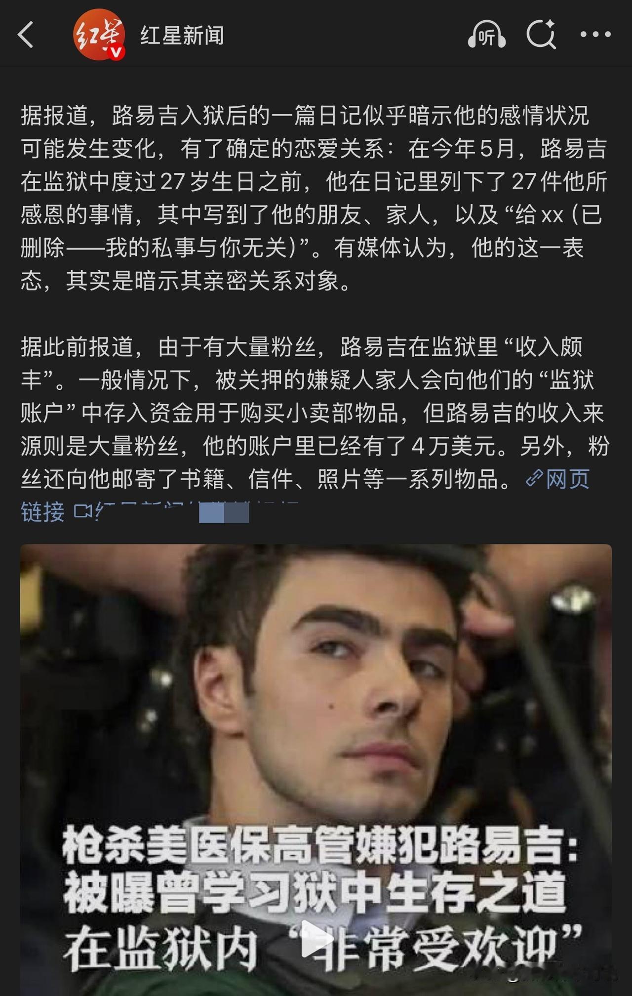路易吉看来的确很受欢迎,就算在监狱里也过得很滋润。这哥们儿之前曾刺杀了美医保公司高管,当时就有很多人对他的行为表示支持和同情,而且还有很多粉丝对其疯狂打Call。就算现在蹲大狱也非常快速的适应了监狱生活,把在监狱的生存之道学了个遍。还担负起了帮新来的狱友快速熟悉规矩的服务活儿,所以获得了狱友的广泛认可。更有意思的是还有很多粉丝给他打钱,使得他的账户上居然积累了4万多美刀,简直用不完。由此可见,美国的医保集团是多么的不得人心,杀人凶手不但没有被大众谴责,反而还得到了大众的尊敬和支持!