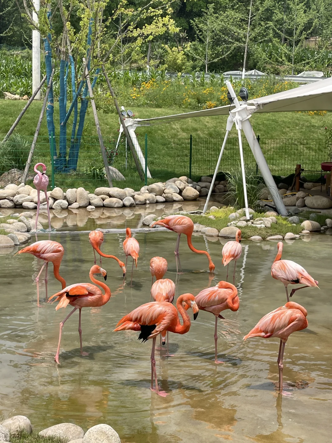 一边吃烤肉一边观赏一群粉色的火烈鸟