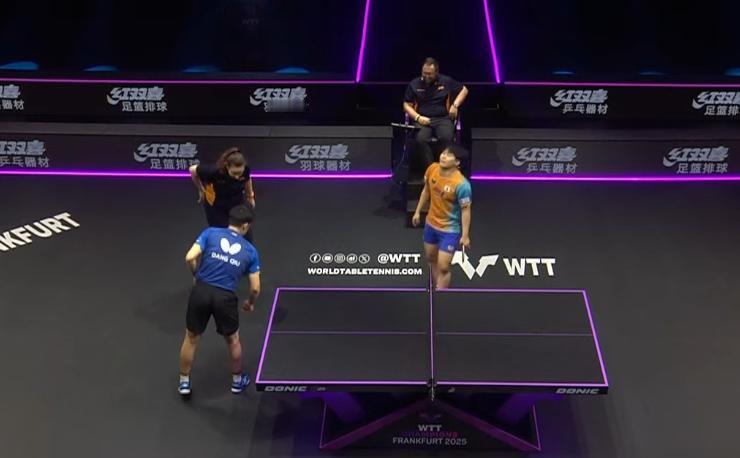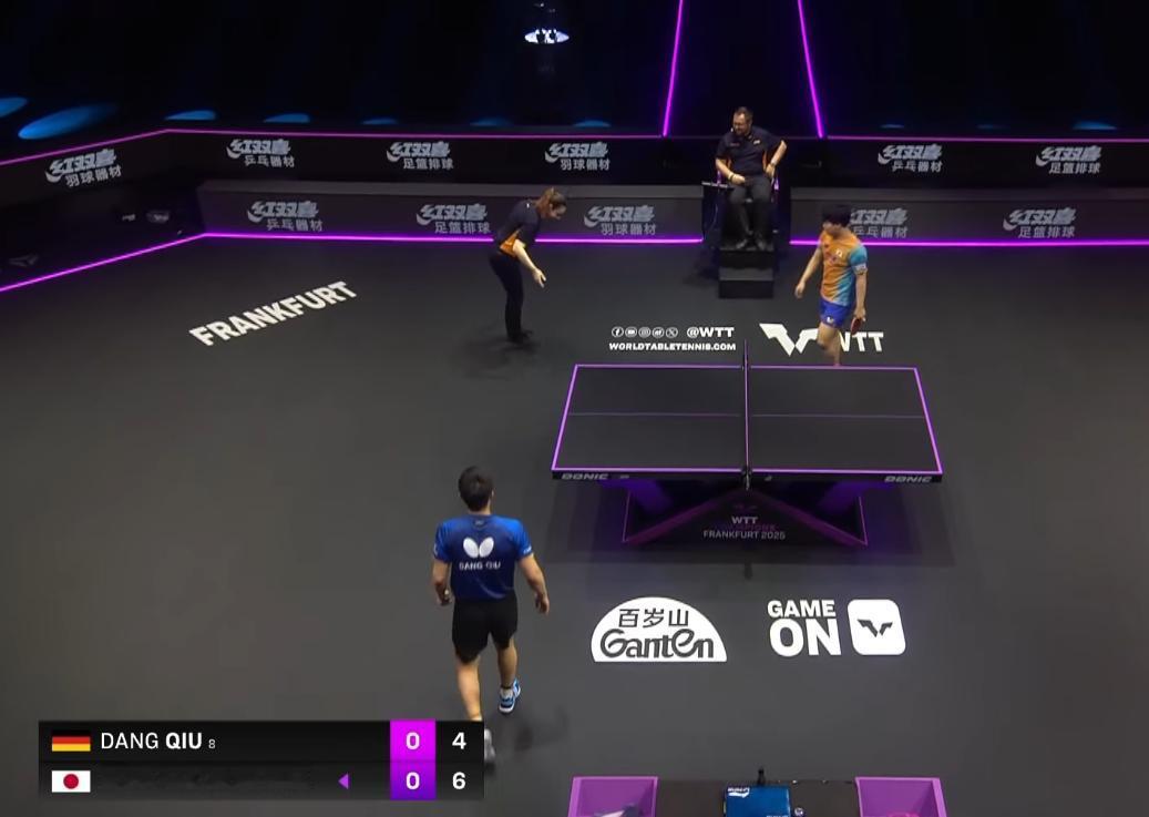 突发!法兰克福决赛时, 邱党差点滑倒, 他暂停比赛, 让主裁判上场, 一家人看着场地, 难道有水吗? 奥,不是, 我看女裁判拿出卫生纸, 包裹着一个异物, 拿了出去。 问题来了, 因为异物, 邱党差点摔倒, 丢了那一分, 还能找回来吗? 从这场比赛来看, 没找回!