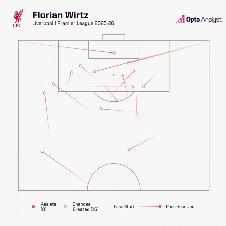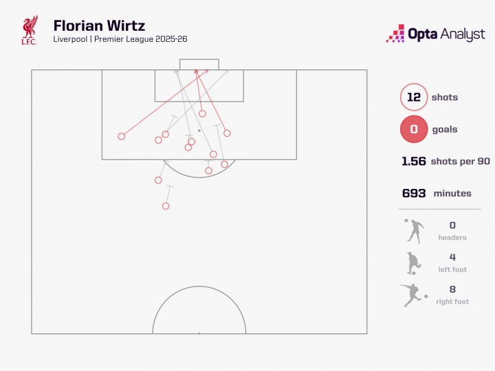 据数据统计,维尔茨在英超联赛中12次射门均未破门,同时他创造的16次机会也未能转化为助攻。