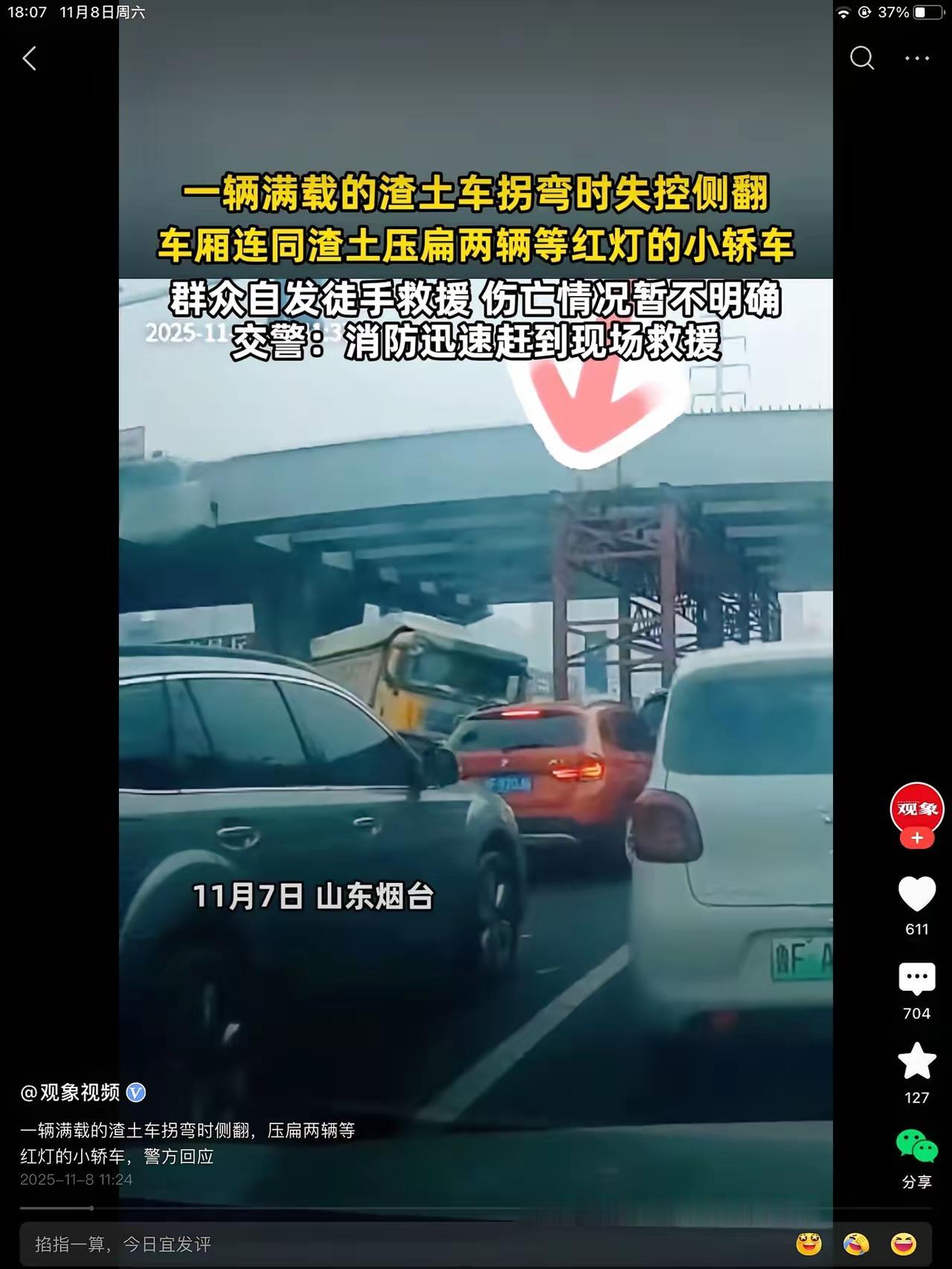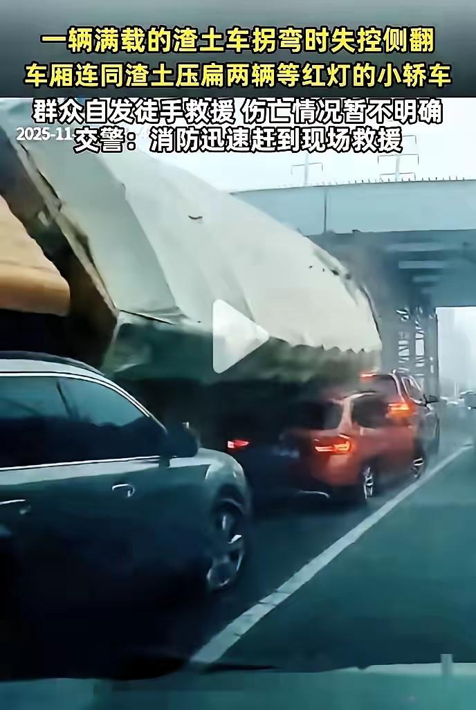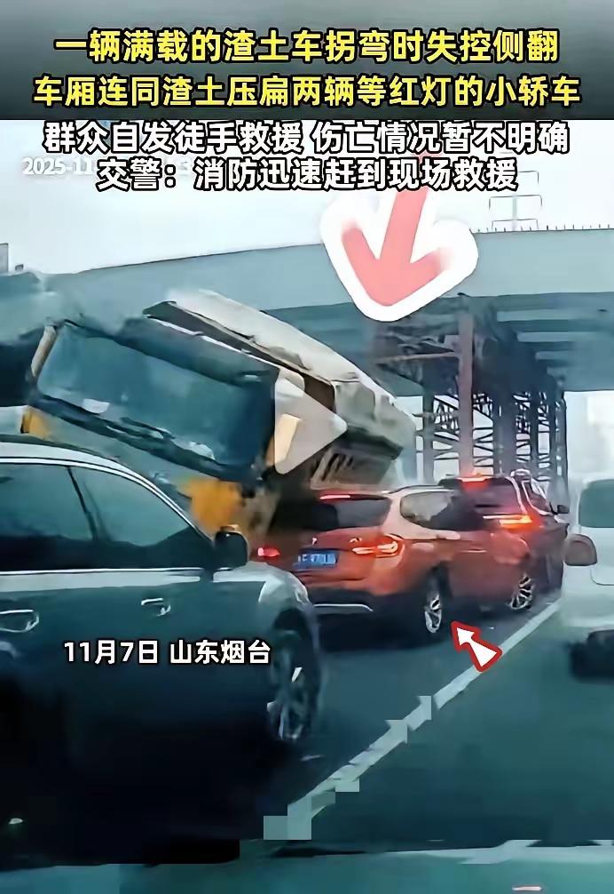11月7日发生的车祸,那个视频,我看了好几遍! 我看着红色宝马车已经打算换道超车,可能她也知道危险来临。 可是,旁边那个车道巧合开过来一辆白色的轿车。 红色宝马车只好踩刹车停住。这个时候,那沙土车开始翻了。 时间就是如此紧迫。 让人反应不过来。 红色宝马车直接让沙土车压住车身。 车子刹那压成了扁的。 宝马车里面的人没了,。 那个重量,别说是人啦,就是钢筋铁骨,也会被压碎了。 那个渣土车转弯太快了,就因为他的操作错误,才造成这样子的惨剧。 说实话,这些大货车,渣土车,他们的司机,在路上开车,根本不刹闸。 他们仗着自己车有保险,额度高,根本不把行人看在眼里。 他们在路上,从不刹车,可谓横冲直撞。 有时候就是下坡,他们都不踩刹车,就是拿命开玩笑。 超载,超速,都是他们干的事情。 他们看见查车的交警,就会躲躲藏藏 ,不让交警查到他们超载,超速。 这样的大货车 ,就是马路杀手。 所以我们天天说要远离大货车,这是有道理的。 这些大货车,渣土车,如果超载超速 ,就要重重的罚他,这样子才能杜绝车祸的发生。 看看红色宝马车就知道,这场车祸的惨烈 。 红色宝马车直接被压成了车片片。 在大货车面前,再贵的车都不堪一击。 红色宝马车里面的那位老师,他们一家人要难过到心碎。 孩子永远失去了妈妈。 丈夫永远失去了妻子。 她的父母永远失去了女儿。 白发人送黑发人的悲伤,又重演。 [祈祷][祈祷][祈祷][祈祷][祈祷][祈祷]