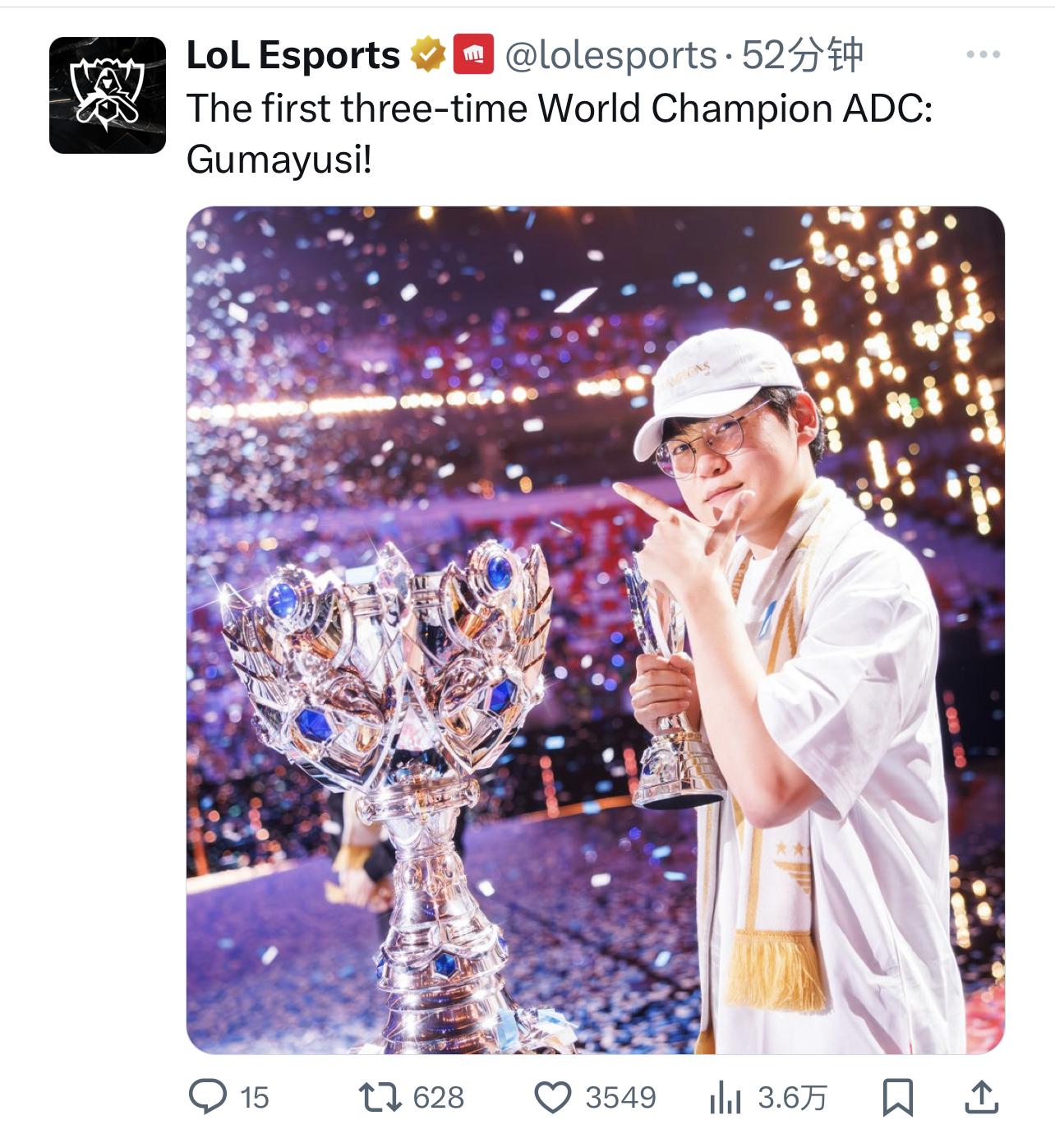 LOL官推分享Gumayusi照片并配文:历史首位三冠ADC