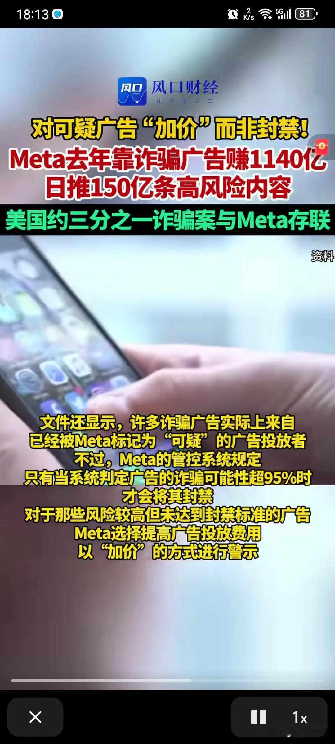扎克伯格这个犹太商人,真的太可恶了,美国人爆料说它mate,也就是以前的脸书,去年靠诈骗广告赚了1140亿,一天推150亿条高风险内容,涉及网络赌博,投资骗局,违禁医疗产品等各种诈骗广告,表面上meta说有审核,实际给钱就可以投广告和投流量,夸张到美国1/3的诈骗都跟扎克伯格的公司有关! 我觉得这个时候为什么会爆出来,其实meta一直都有这些问题,我觉得就是因为它本来是民主党的,后面站队了川普,现在可能是民主党在搞他,期中选举快到了,所以要扎克伯格的平台去助选了,而扎克伯格又怕川普整它,估计就没有答应民主党,所以爆料就出来了!