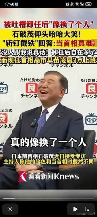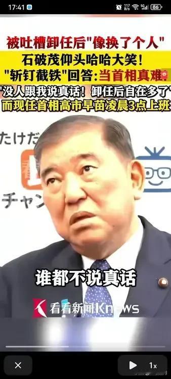 石破茂一下台跟换了一个人似的,接受采访是,开怀大笑,记者问它为什么这么开心,是因为卸任了吗?它说是的!记者问为什么卸任就像换了一个人,它说因为当日本首相的时候,谁都不能说真话,容易被出卖了,所以整天高度紧张,现在卸任了,就不用担心这些,所以感到格外轻松! 一直都说日本假,石破茂的首相之旅就是最好的说明,谁都不可以说真话,要不然分分钟出事,首相都这样了,说明这个日本社会到底有多虚伪,前两天也看到一个日本博主吐槽自己非常讨厌日本人的原因,就是日本人太假了,假装有礼貌,假装友善,假装微笑,实际非常腹黑,跟自己的朋友甚至家人,都从来不吐露真心话,都还是在伪装!