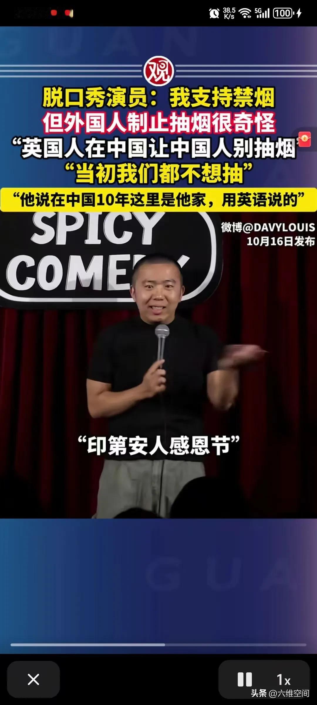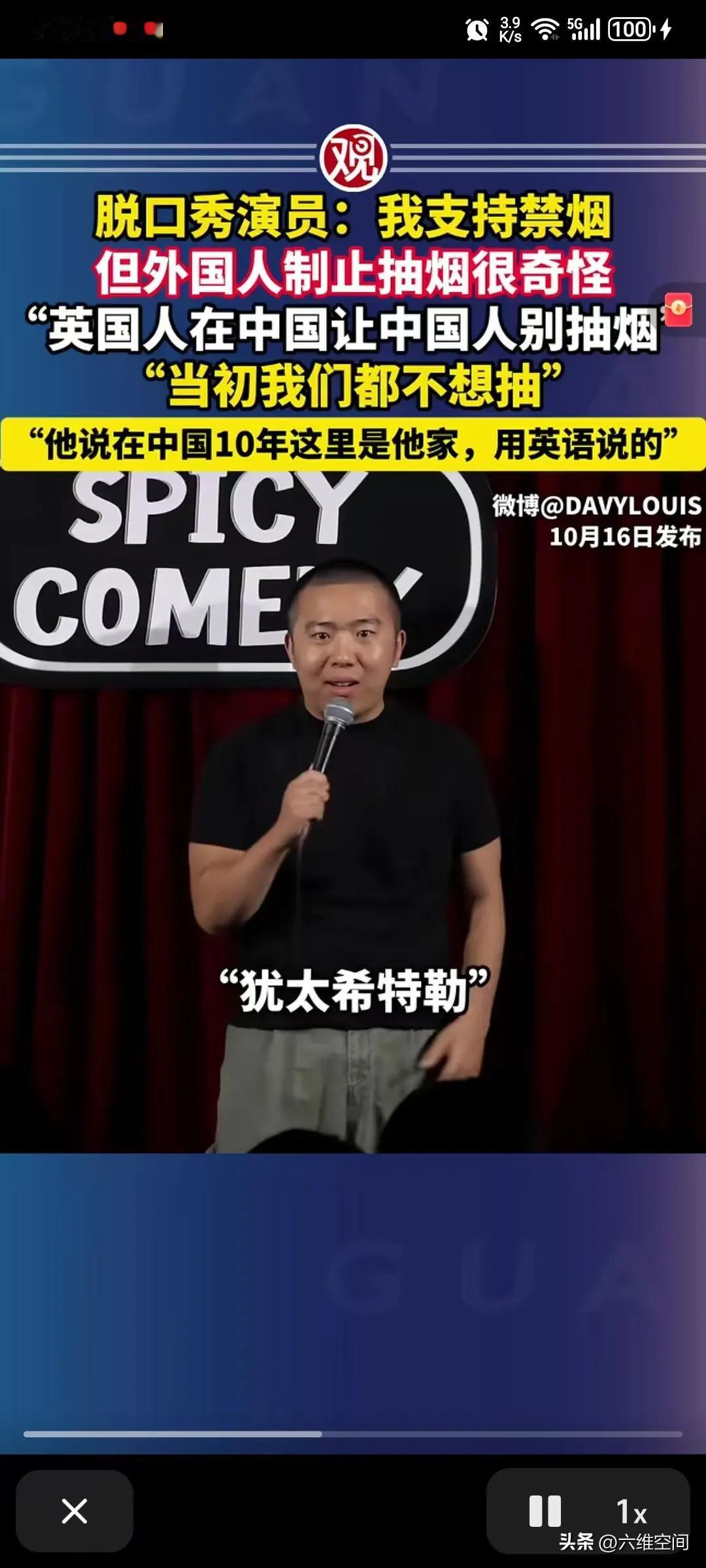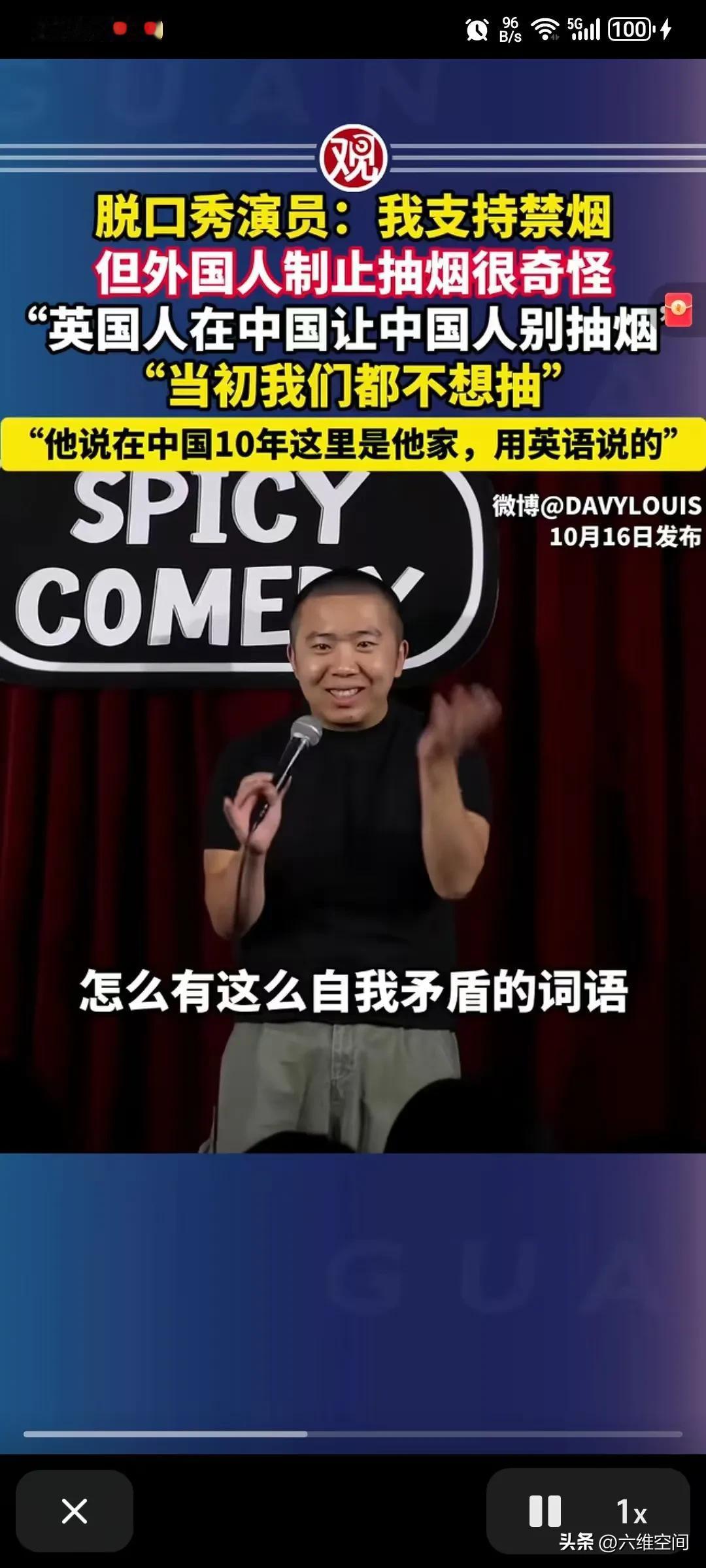 中国脱口秀演员吐槽英国博主在中国制止抽烟,当然这个中国脱口秀演员也表示支持禁烟,但是觉得这个英国人在中国制止抽烟非常奇怪,因为历史的原因,英国人可以说是最没有资格要求中国人不要抽烟的,但是有些网友还给这个英国人取名叫“英国林则徐”,这非常不妥,因为就像“犹太希特勒”和“印地安感恩节”一样荒唐,非常自相矛盾的词语,在引起争议后,这个英国人发视频说自己在中国10年了,所以把中国当家了,所以才会想制止抽烟,但是它说这段话的时候用的是英语,都当家了,而且还是对中国人说的,却还用英语,更加奇怪了! 大概的内容是这样,大家有兴趣可以搜这个视频去看一下,我觉得这个中国脱口秀演员吐槽得非常有道理,我自己觉得这些外国人干这些事情就是为了博流量,制造话题吸睛而已,更加会引起烟民的反感,反而是事倍功半!